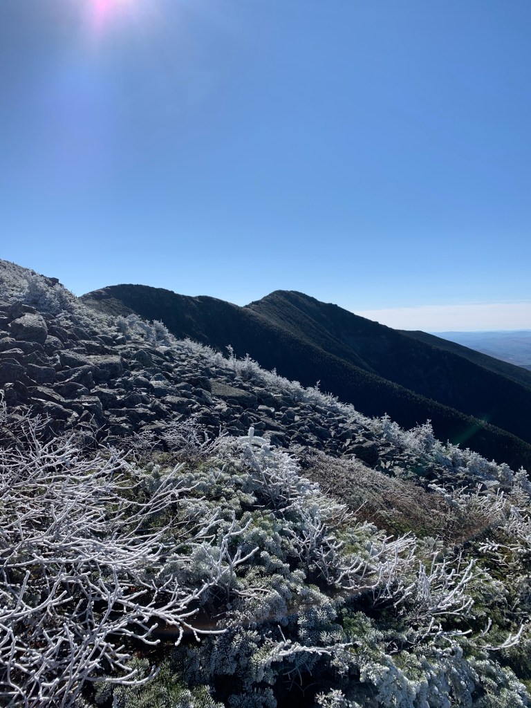 There was a consistent breeze all the way up Falling Waters. I had removed a layer on the way up, it was quite a workout and I was getting hot. As I approached the Little Haystack summit, I could hear the wind intensity. When I stepped above tree line, it hit me. The wind took my breath away. I found some shelter in the lee of some rocks on the southern side of the summit. I took my pack off, located a wind breaker, warm gloves, my hat and a granola bar. In the time I had my gloves off to locate things and eat, my finger tips had gotten so cold they started to hurt. The air temp was about 20 with wind sustained at 35 and gusting to 45 or 50. This combination put the wind chill at about 0 degrees. I bundled up, put my pack back on and stepped back out onto the ridge. Into the wind.