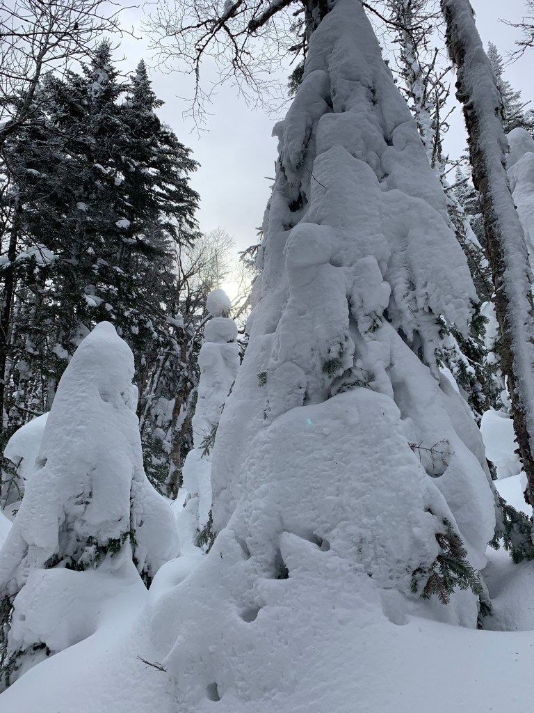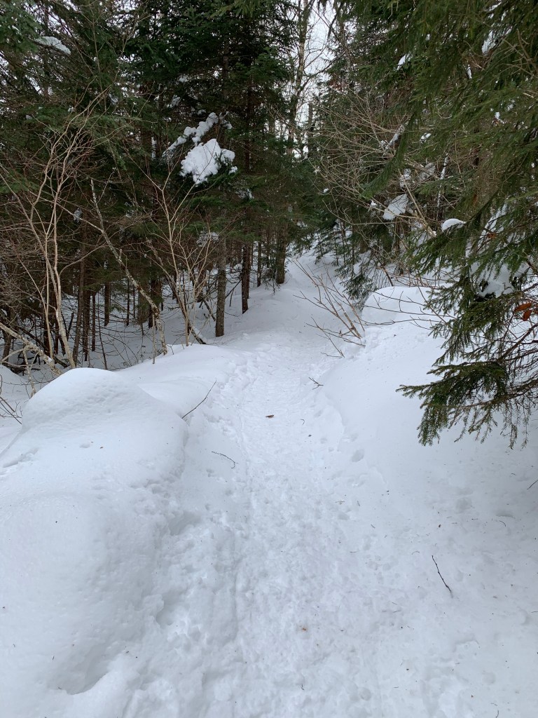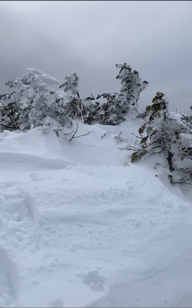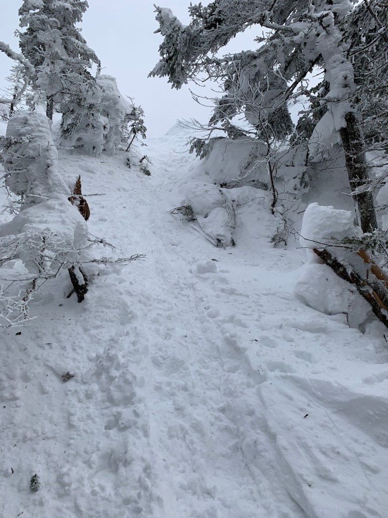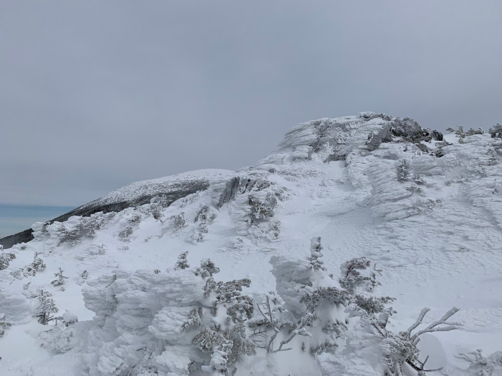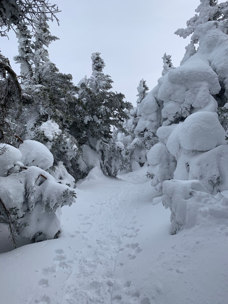 Getting to the summit of Eisenhower was my reason for being back here so soon. It was not an easy hike. The closer I got to Eisenhower the icier the trail became. I did manage to climb the steep sections with my showshoes on. I was thinking that the snowshoes may not be appropriate for the descent given the ice. I skied a couple time on the way and didn’t want to lose traction on the coming down the steeps of Eisenhower.
