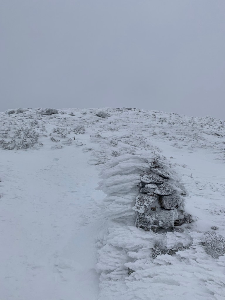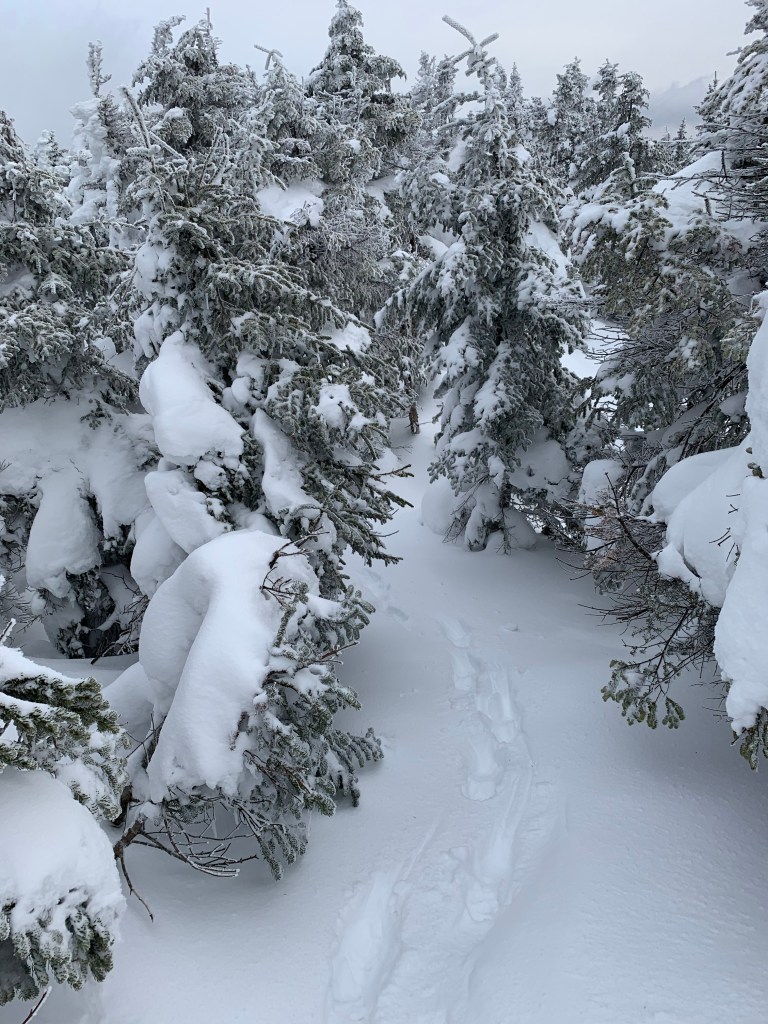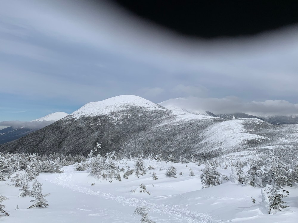 After getting just below the summit of Pierce, I jumped down over the ledge to continue toward Mt Eisenhower. I quickly noticed that this trail was not packed at all. I was following a single set of post holing foot prints. In the distance, I cold see the silhouette of a hiker. I cant imaging doing the walk to Pierce to Eisenhower without snowshoes. I had tried. Failed. Thankfully he preceded me as it made the way easier to find. It is all exposed ridge with visibility of Pierce and Eisenhower pretty much the entire way but it was nice to follow some steps.