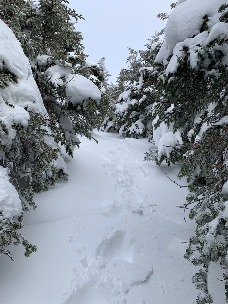 This was my second ascent of Mt Pierce in 2 weeks. I knew what to expect, I thought. I met a couple returning from the top via Crawford Path and they told me about 4′ – 8′ drifts just below the summit of Peirce. To this point, about 3/4 up Pierce, I was using Micro Spikes. I stopped and put on my snowshoes.