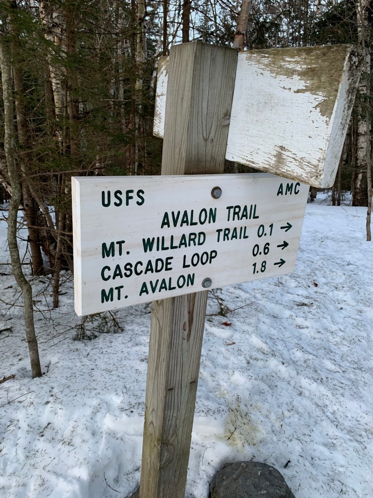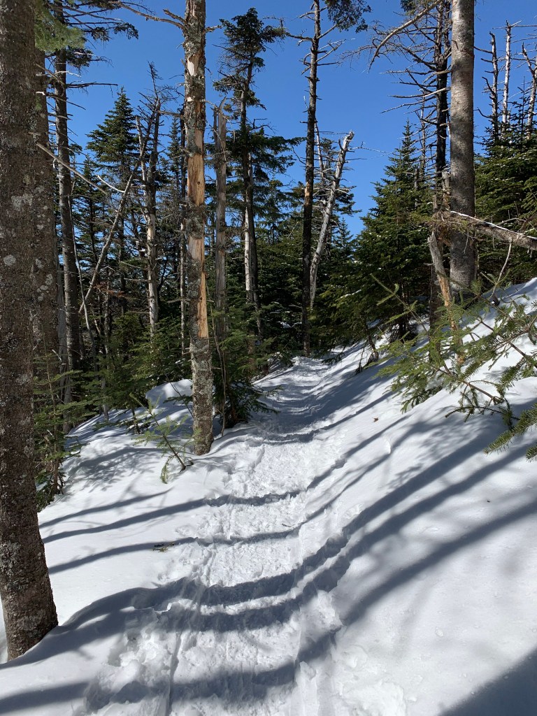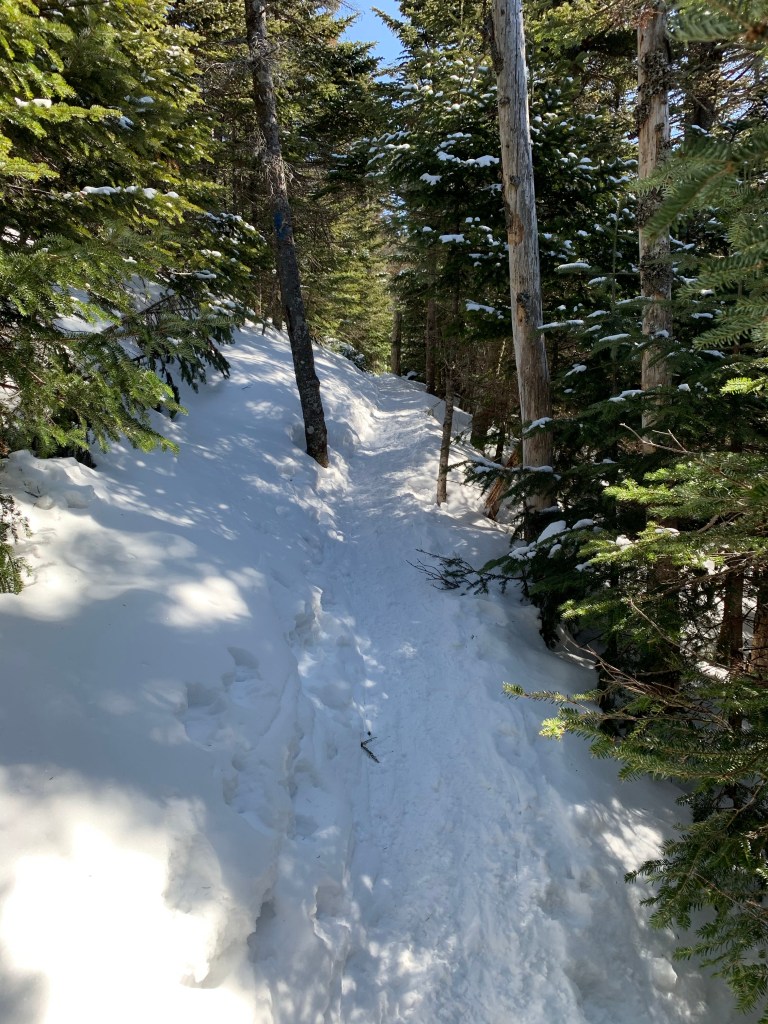 The first mile and a half or so was on the Avalon trail. Well packed and moderately steep in parts it was smooth to the junction of the A-Z Trail. A-Z got a bit more loosely packed and was still doable in spikes but I decided to put my snow shoes on so I would use less energy. The trail grew gradually more steep. I soon encountered really the only sketchy section of the hike. I was cutting across a very steep ravine, on a narrow path of drifting snow in snow shoes. I’ve been through MUCH worse but did stop recording so I could pay attention.