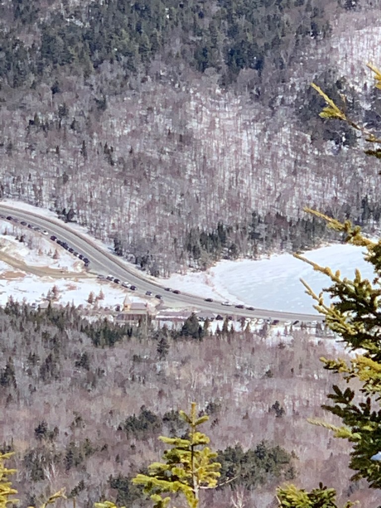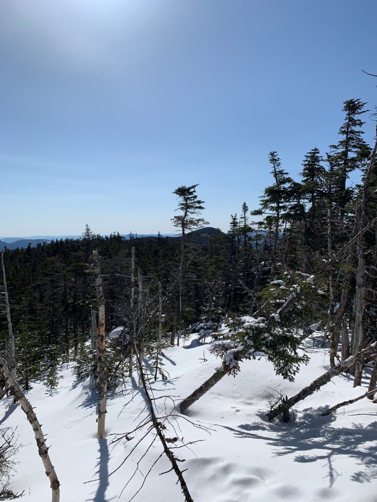 I took off my pack and snow shoes on Willey. Chatted with some people and shared a sandwich with the grey jays. The view down over Crawford Notch and the Presidentials to the east is amazing. Some more people showed uo and I took as my queue to depart the summit and head back for the dreaded ascent of Mt Field, again.