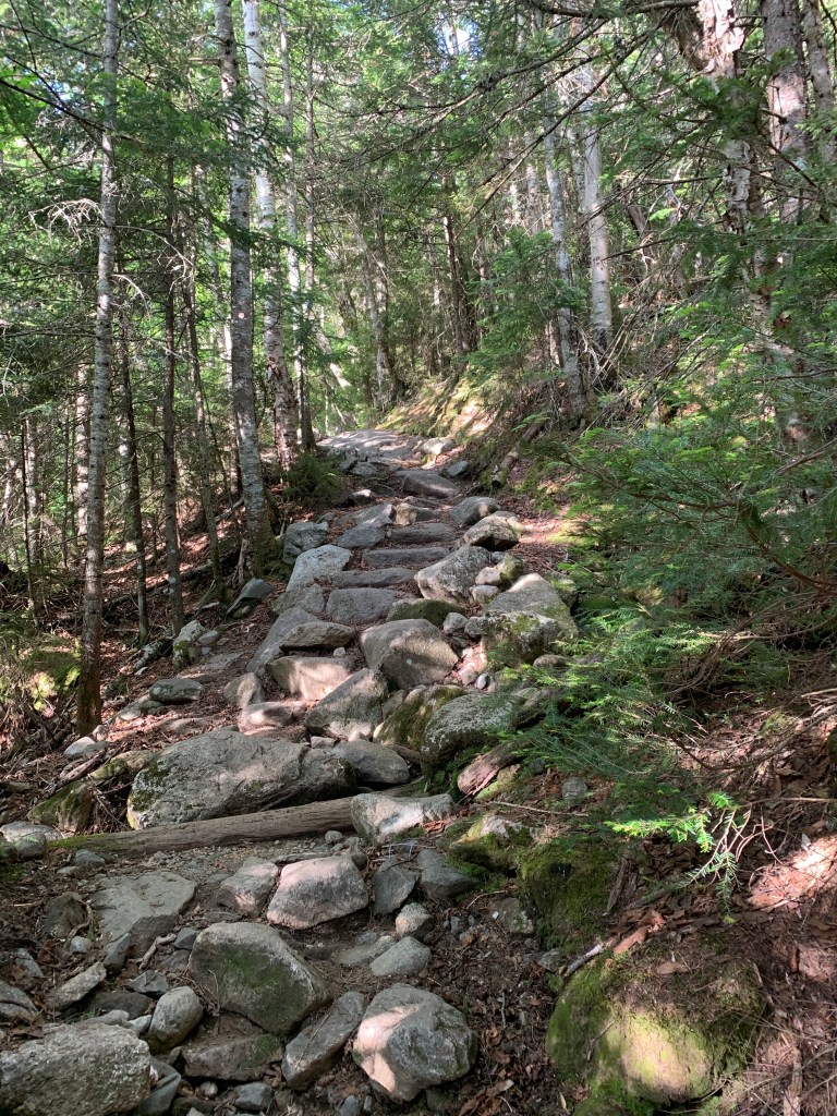 Valley way starts pretty flat for the first mile or so. There is a side trail that pretty much parallels it and runs along the river, closer to the falls. I stayed on Valley Way and hit the falls on the way back down. The trail started to go up a bit at about the 1-mile mark and my mile 2 was pretty steep. The steeps were sustained until just before the Madison Spring Hut where it levels out a bit in the col between Madison and Adams.