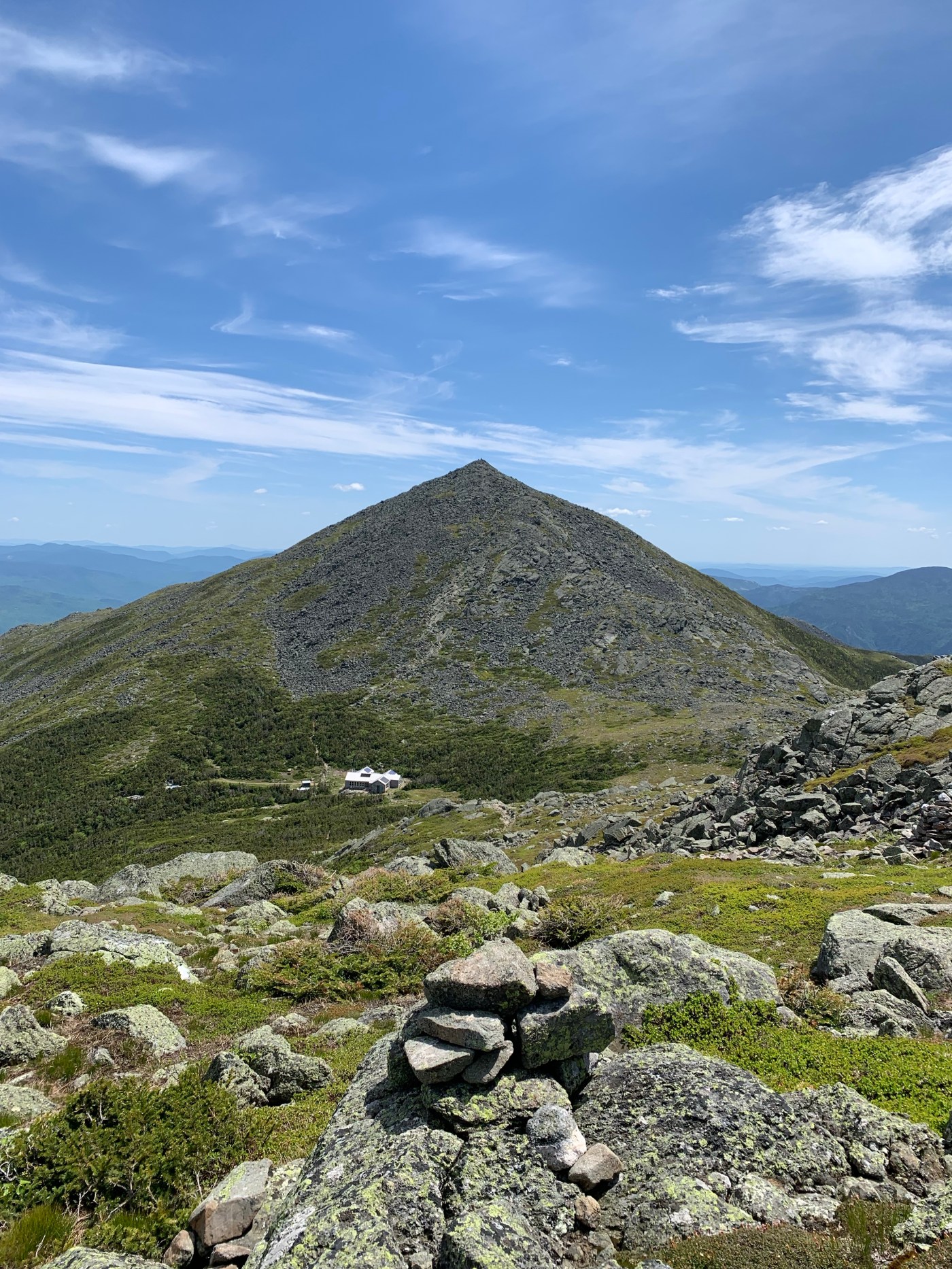 I wrapped my way around the hut to the trail that leads to the summit of Madison. It was very steep and required lots of scrambling. The trail was marked with blazes and large cairns. Thankfully the boulders were very dry and the grip was really good. I made my way up in about 30 minutes I think. The view was amazing. The wind was light, the sky blue with puffy clouds.