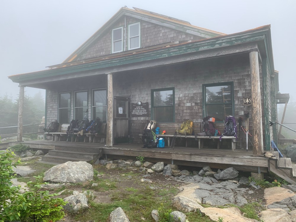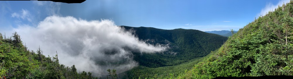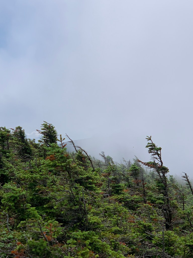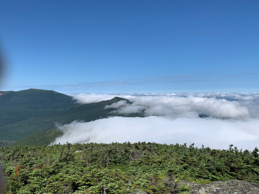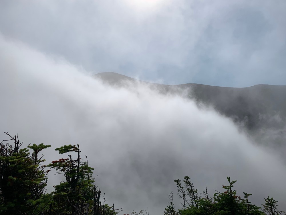 Once beyond the intersection of Gale River and Garfield Ridge the trail leveled off and traversed the ridge to the Galehead Hut. I snapped a photo or two of the hut and admired the location where I suspect there is an amazing view when the clouds a higher. After this 5 minute break, I walked past the hut and continued up Galehead via the Frost Trail. This is about a mile round trip from the hut. I should have dropped my pack for this but didn’t think about it until I was almost to the summit. I met the most amazing lookout and view about 3/4 of the way up. Clouds were drifting through the col between Galehead and The Twins. I was at eye level with a cloud with South Twin peaking above from time to time. There are no words to describe it.