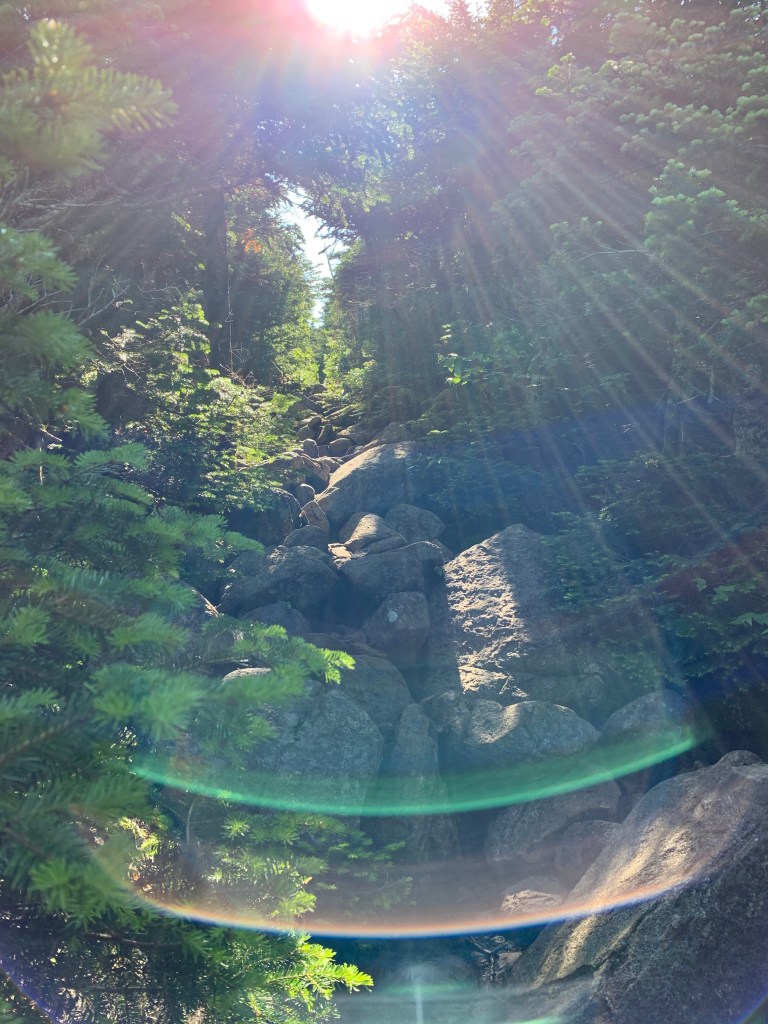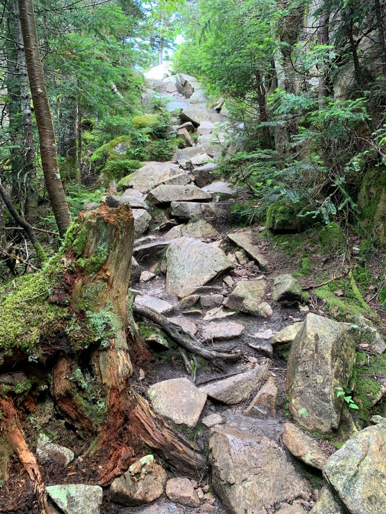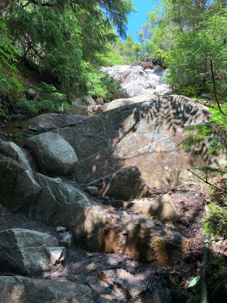 I encountered very wet swampy type areas followed by sideways slanted slabs at 45 degrees that were wet and slippery. Bog bridges followed by ladders. I had not planned my water very well and was down to about a liter. Should be enough to get me the next several miles but I felt I wanted more just to be safe and comfortable. Ascending one of the very difficult and steep scrambles I pulled to let someone come down. A brief chat revealed that I can filter water just ahead in a waterfall in the middle of the trail. I did not know I would also have to ascend the waterfall. I climbed partway up to where I could take my pack off and get my water filter. I filtered a liter pretty quickly and drank a full bag the ice-cold water. I watched as a few hikers came down the partially dried-up falls. Scooting down very carefully, they arrived at the bottom. The duration of the falls scramble was at least 100 feet. Very steep angle and boulders so big I had to pull myself up and slide onto ledges. Once on a ledge, I’d plan the next step. I made a point to focus straight ahead and not think about what was behind me. This tactic helps me through the steep exposed portion of the trails.
