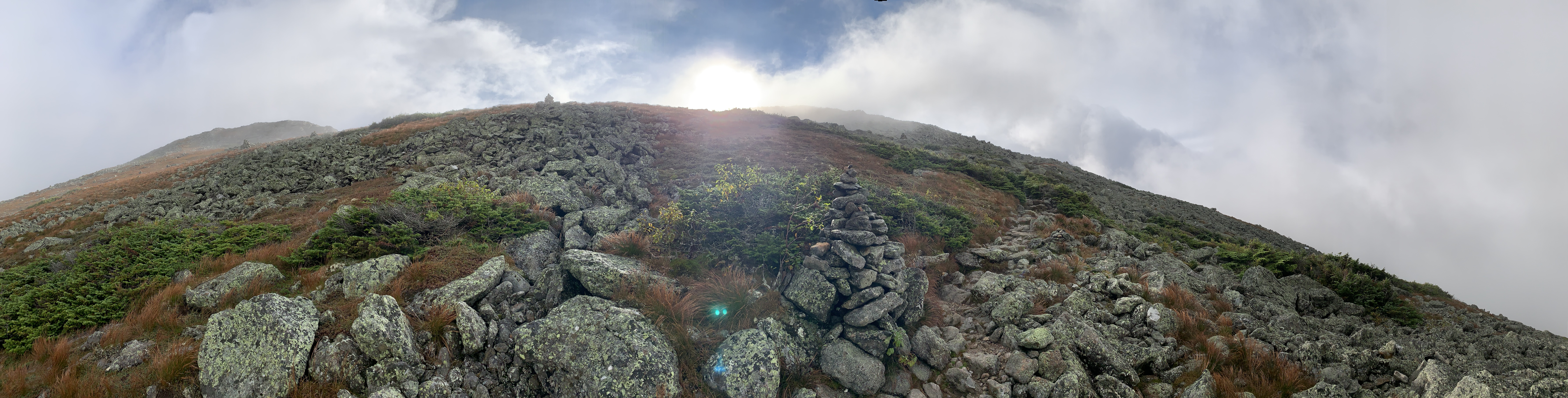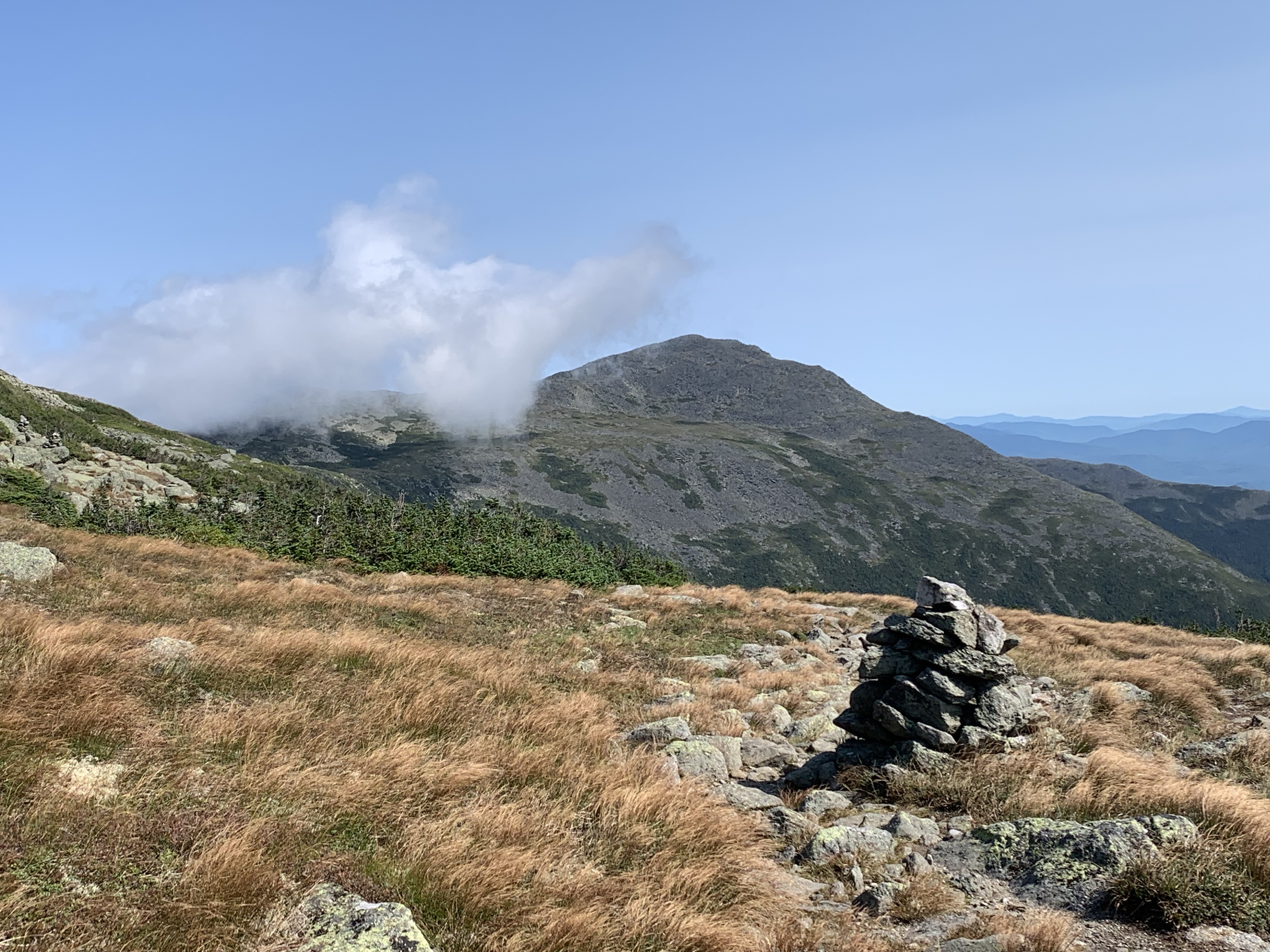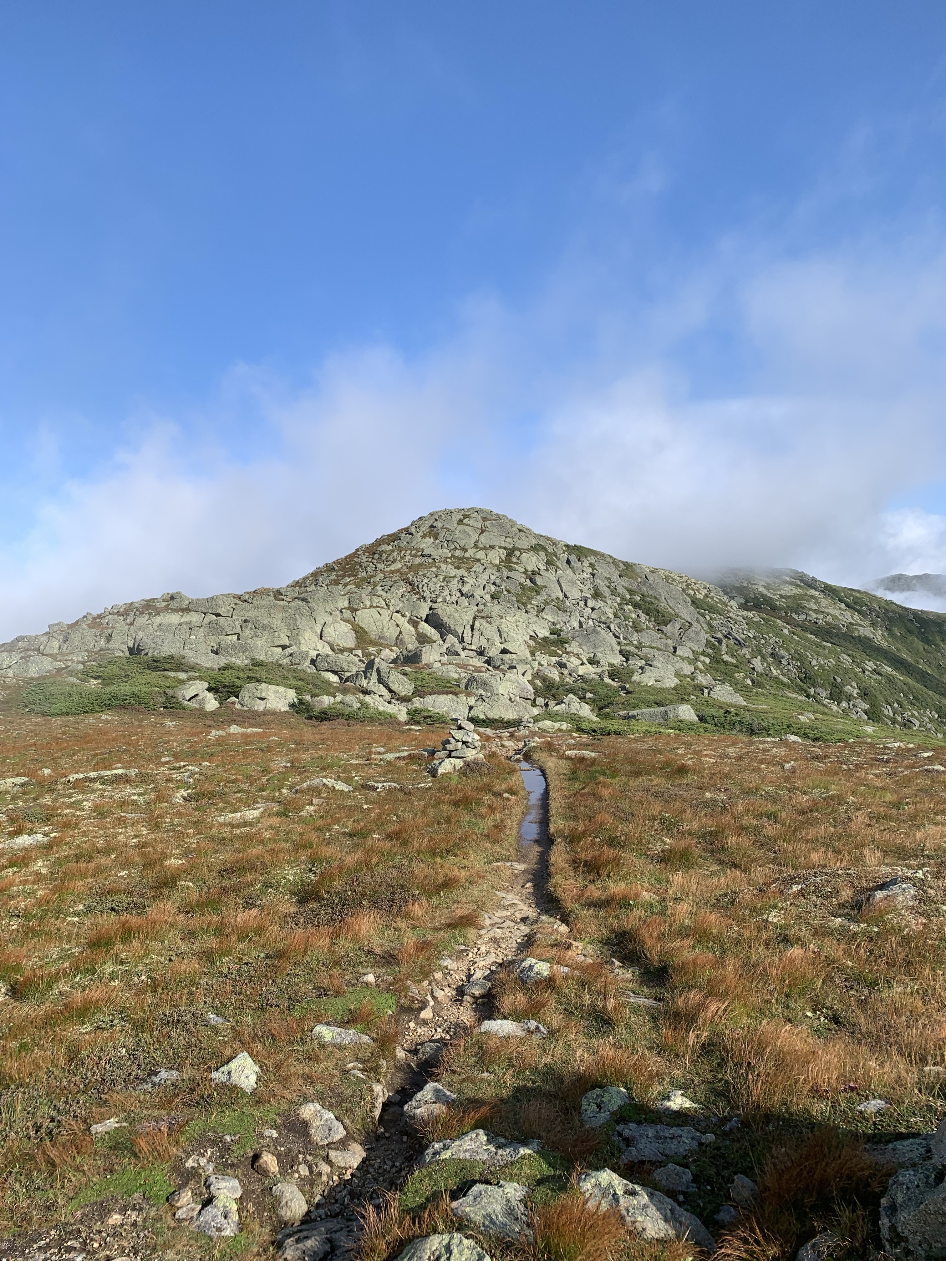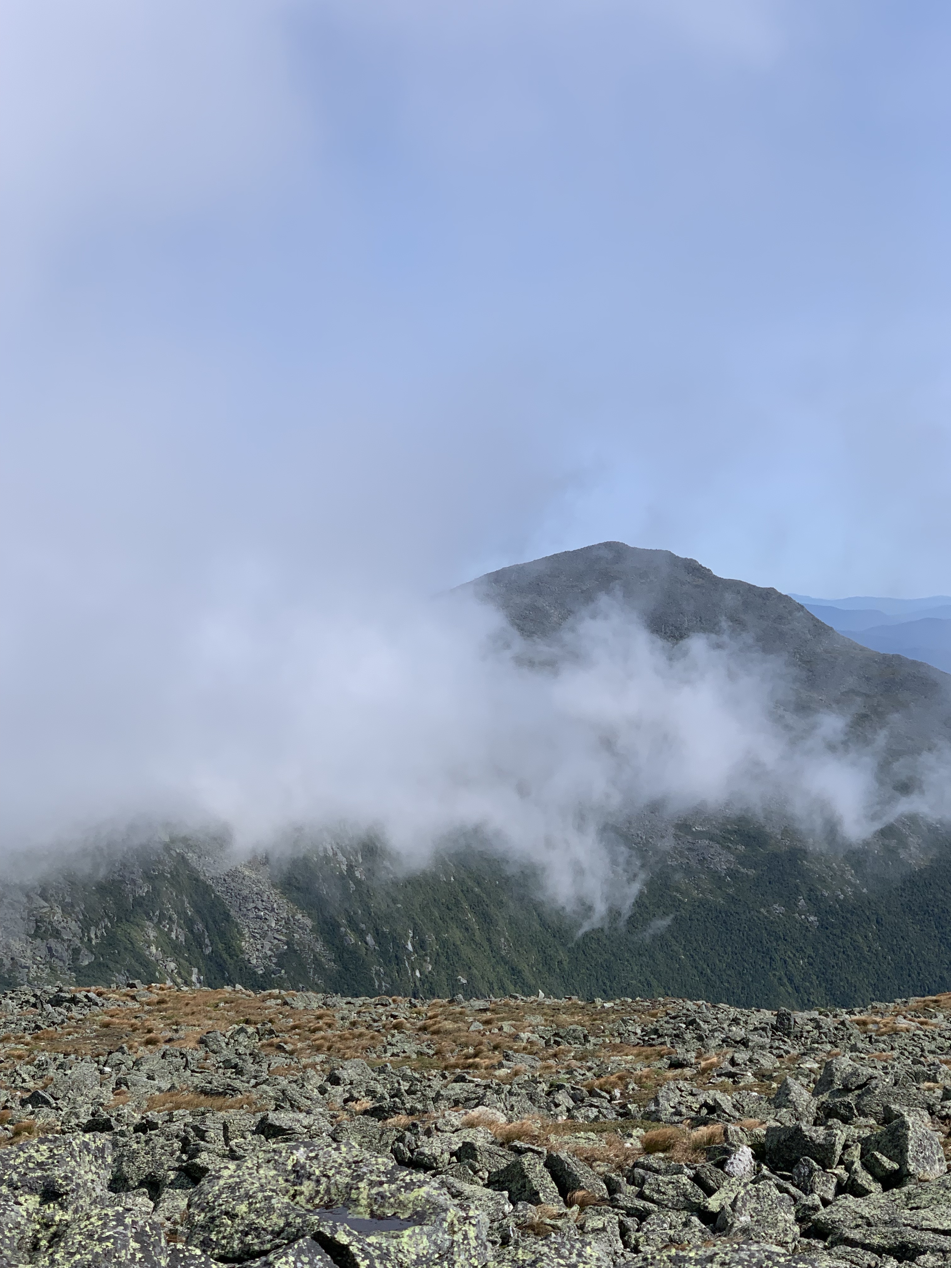 I made my way down the much steeper north side of Mt Clay toward Mt Jefferson. It was almost like a prairie in the col leading to the top of the mountain. Not many boulders and a beautiful trail through the grass. Jefferson was kind of sheltering me from the harsh winds. The clouds streaming around seemed to dance with the ridges. So much fun to take some time and watch this unfold. A front was coming through, clearing the skies.