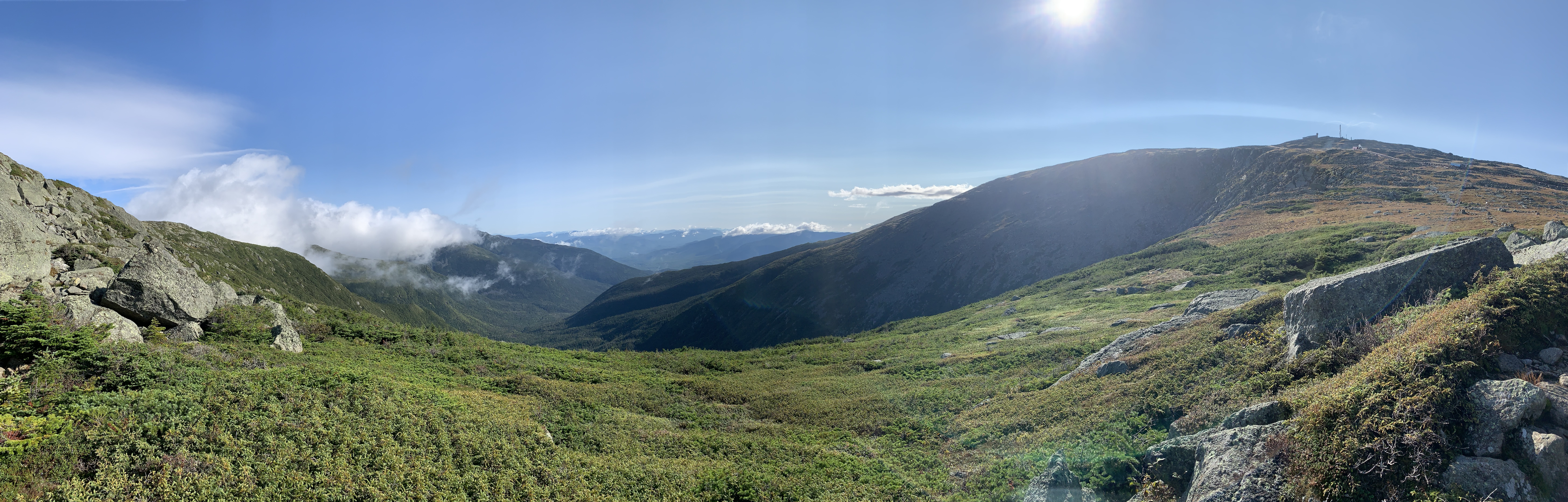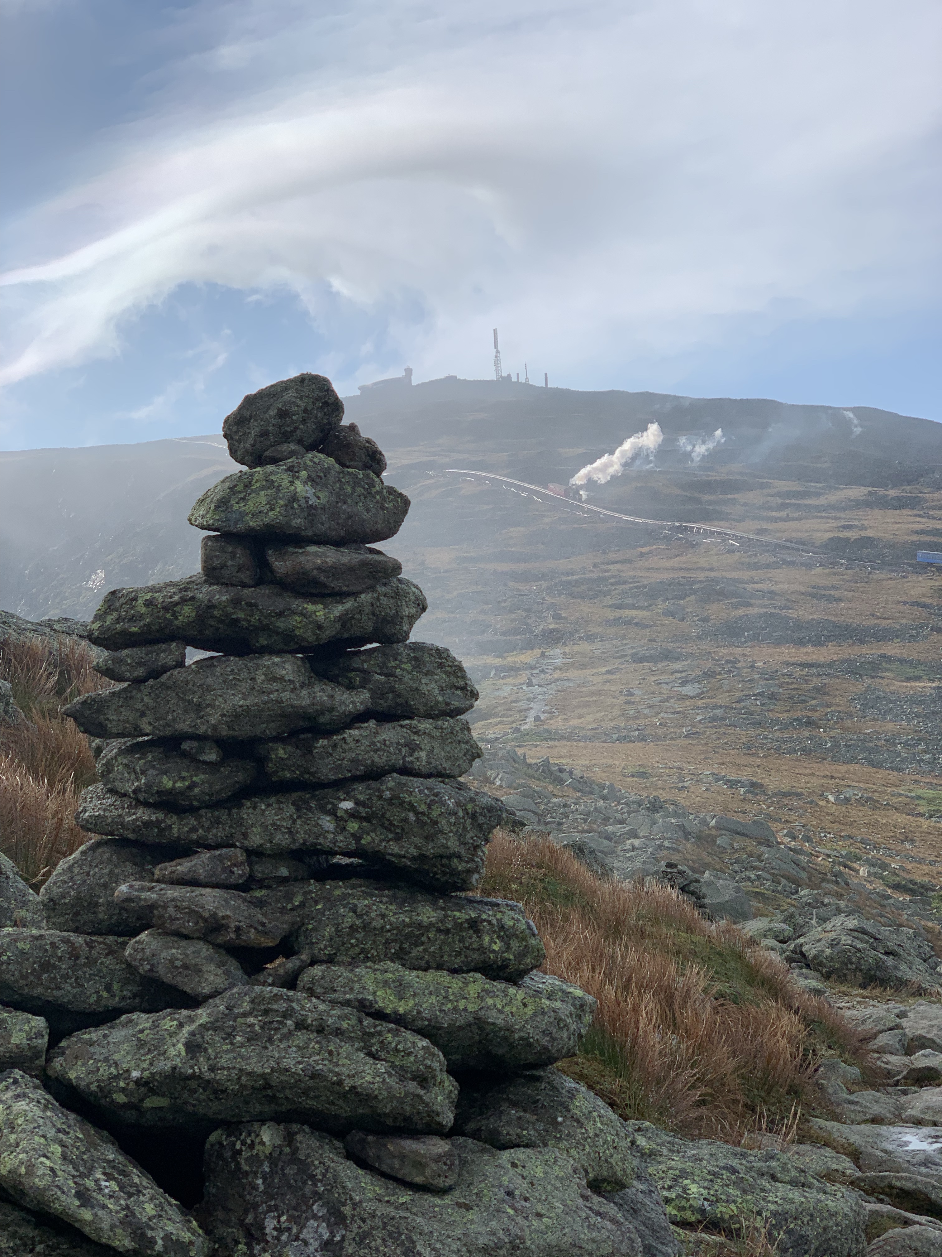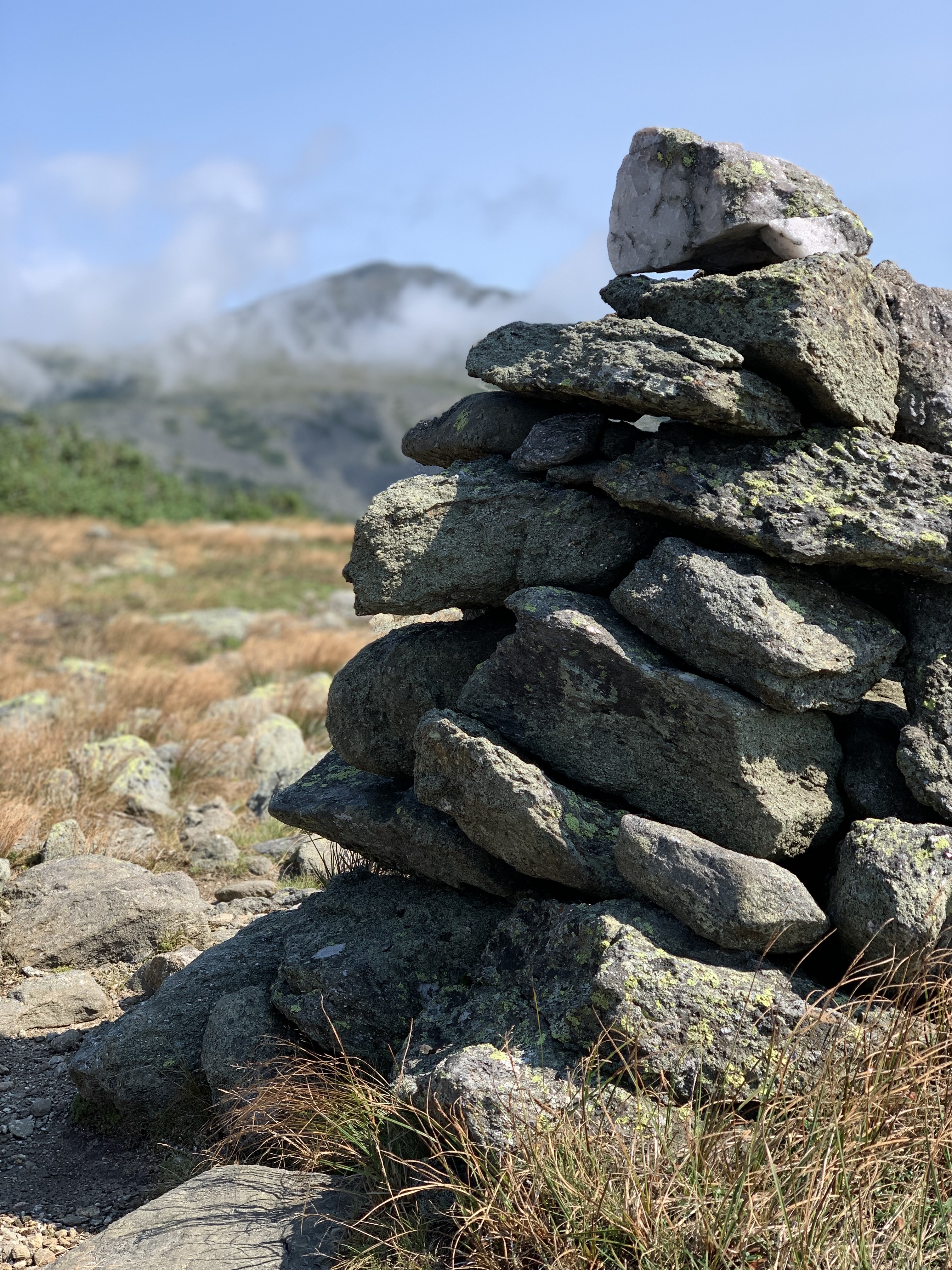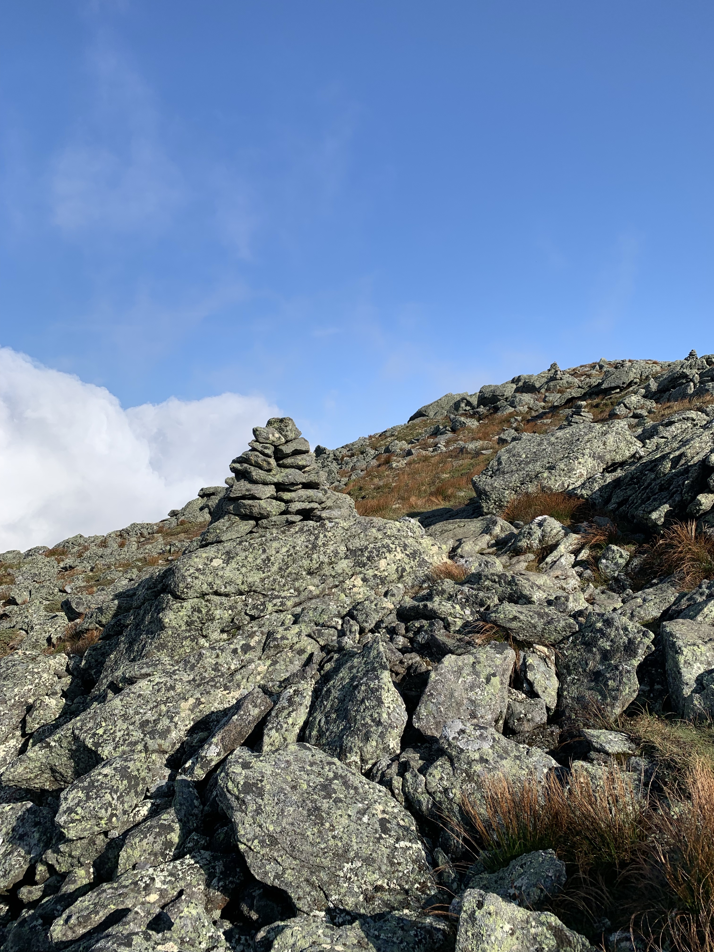 I made my way down the much steeper north side of Mt Clay toward Mt Jefferson. It was almost like a prairie in the col leading to the top of the mountain. Not many boulders and a beautiful trail through the grass. Jefferson was kind of sheltering me from the harsh winds. The clouds streaming around seemed to dance with the ridges. So much fun to take some time and watch this unfold. A front was coming through, clearing the skies.