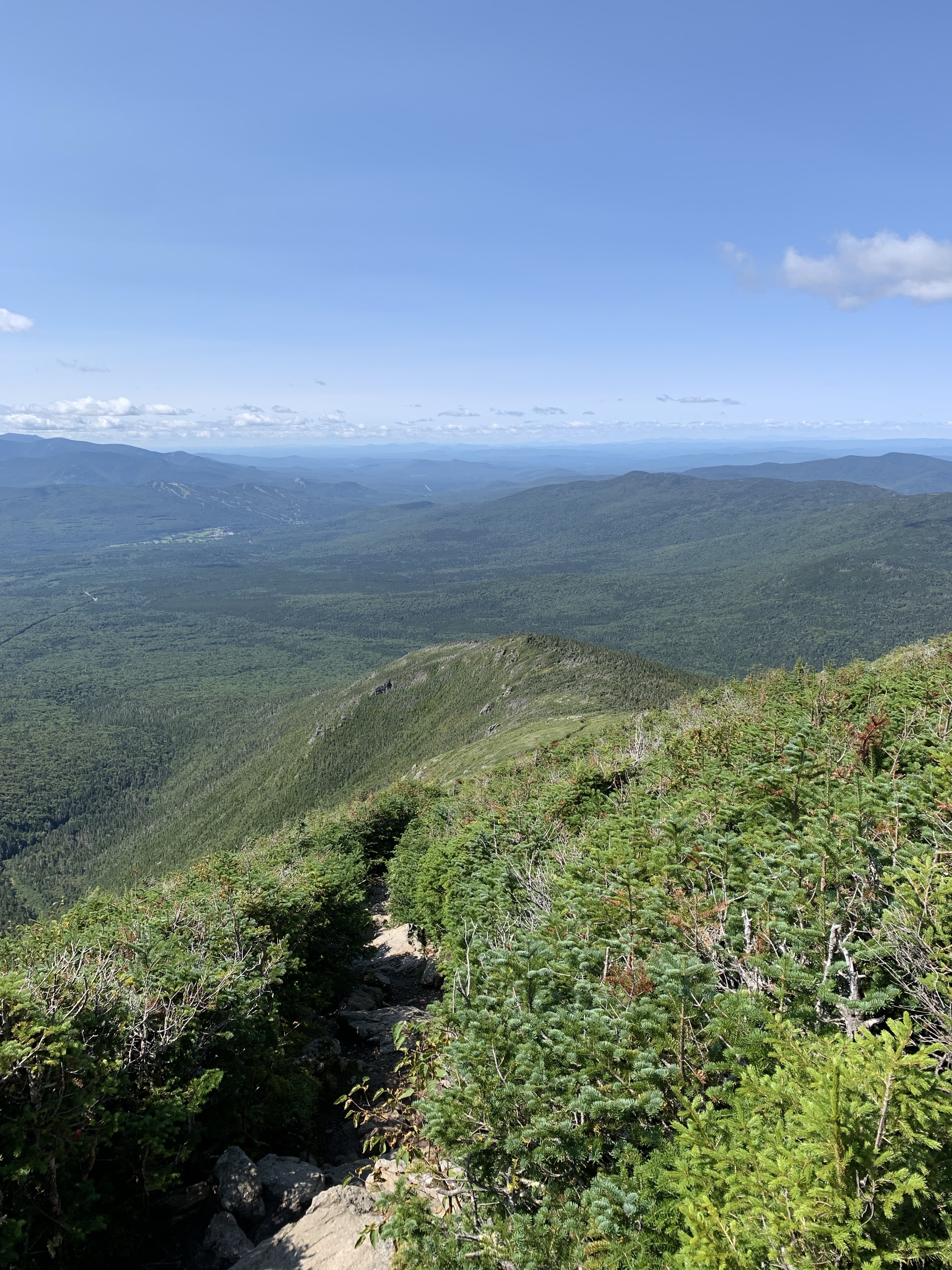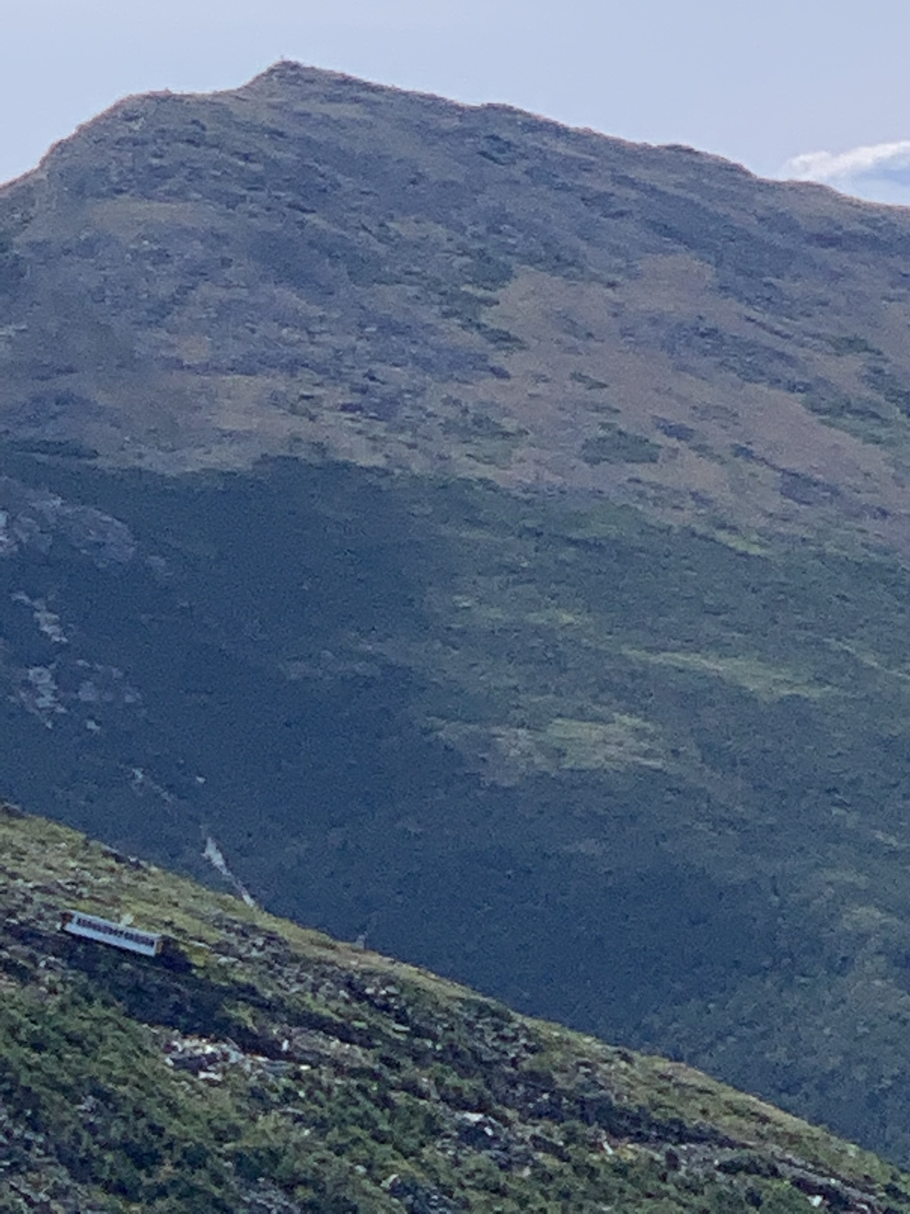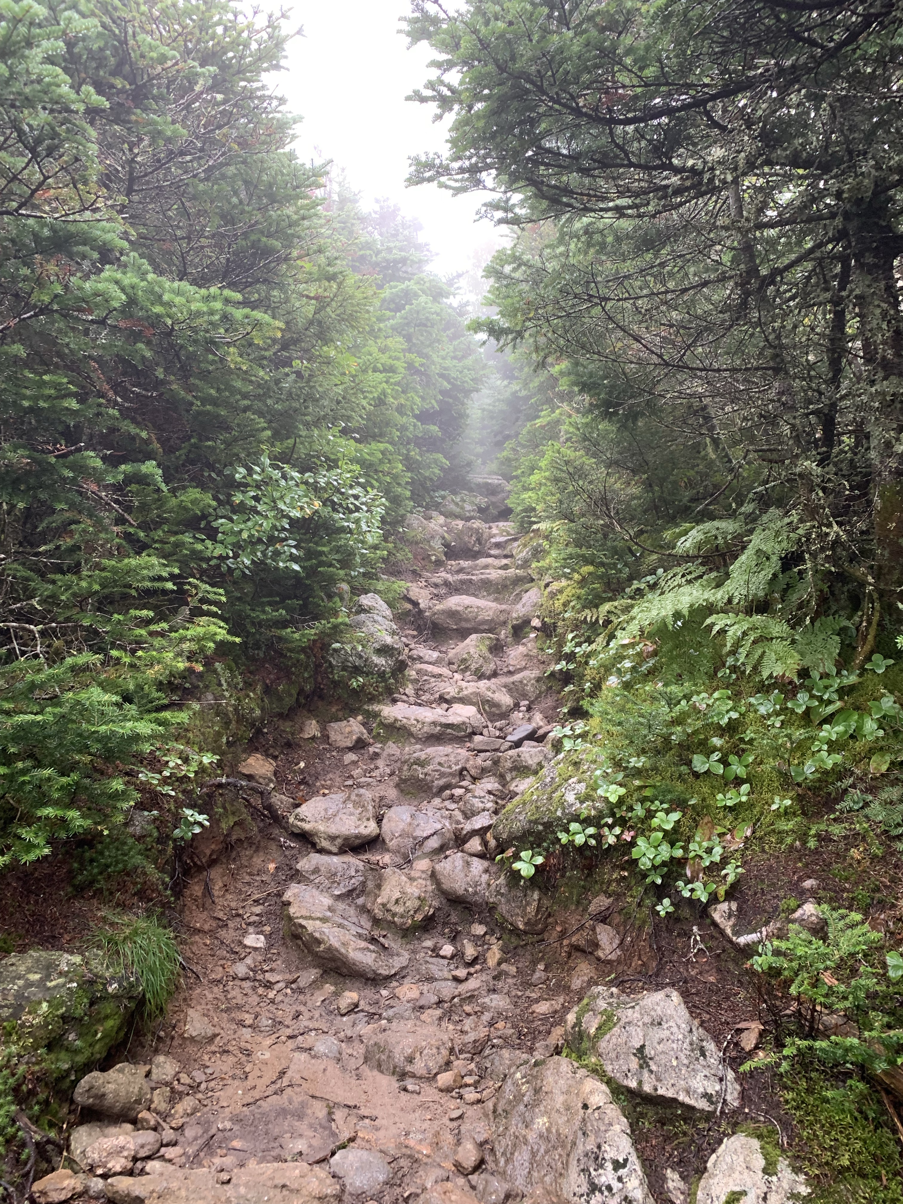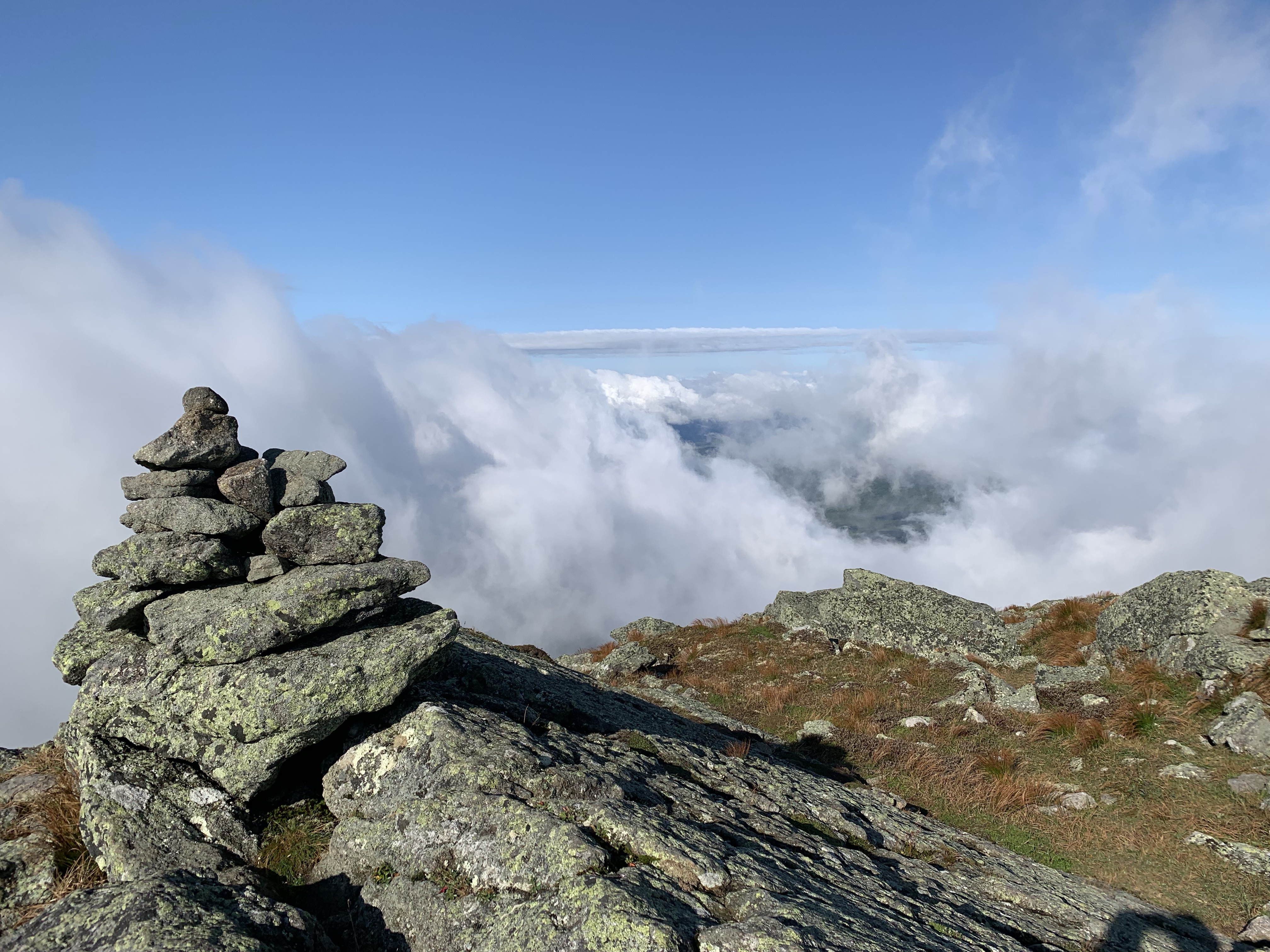 I made my way down the much steeper north side of Mt Clay toward Mt Jefferson. It was almost like a prairie in the col leading to the top of the mountain. Not many boulders and a beautiful trail through the grass. Jefferson was kind of sheltering me from the harsh winds. The clouds streaming around seemed to dance with the ridges. So much fun to take some time and watch this unfold. A front was coming through, clearing the skies.