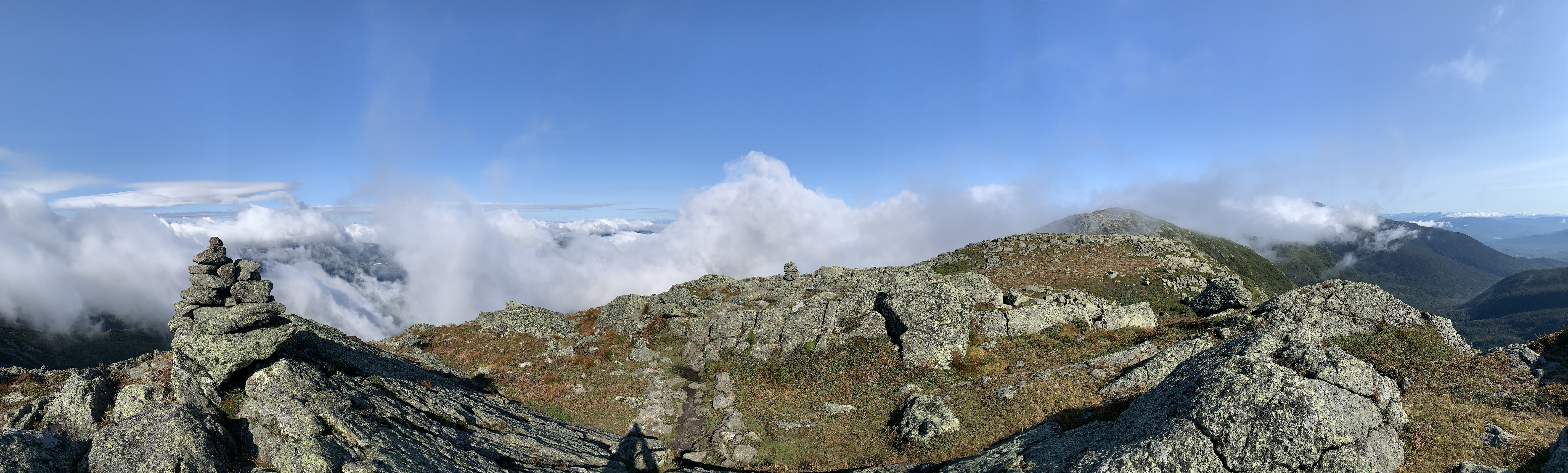 At 5,531′, Mt Clay is no slouch. From the south it only has about 150′ of prominence but it is steep and deceiving. The views, as seen above, are hard to describe. Grassy alpine fields to rock and boulder scrambling. There is a false summit to go over into a col before the final Clay summit. I found a sheltered spot here to get my wind breaker on. As I made my way up the side of clay, the wind increased in intensity to what felt like around 40 mph.