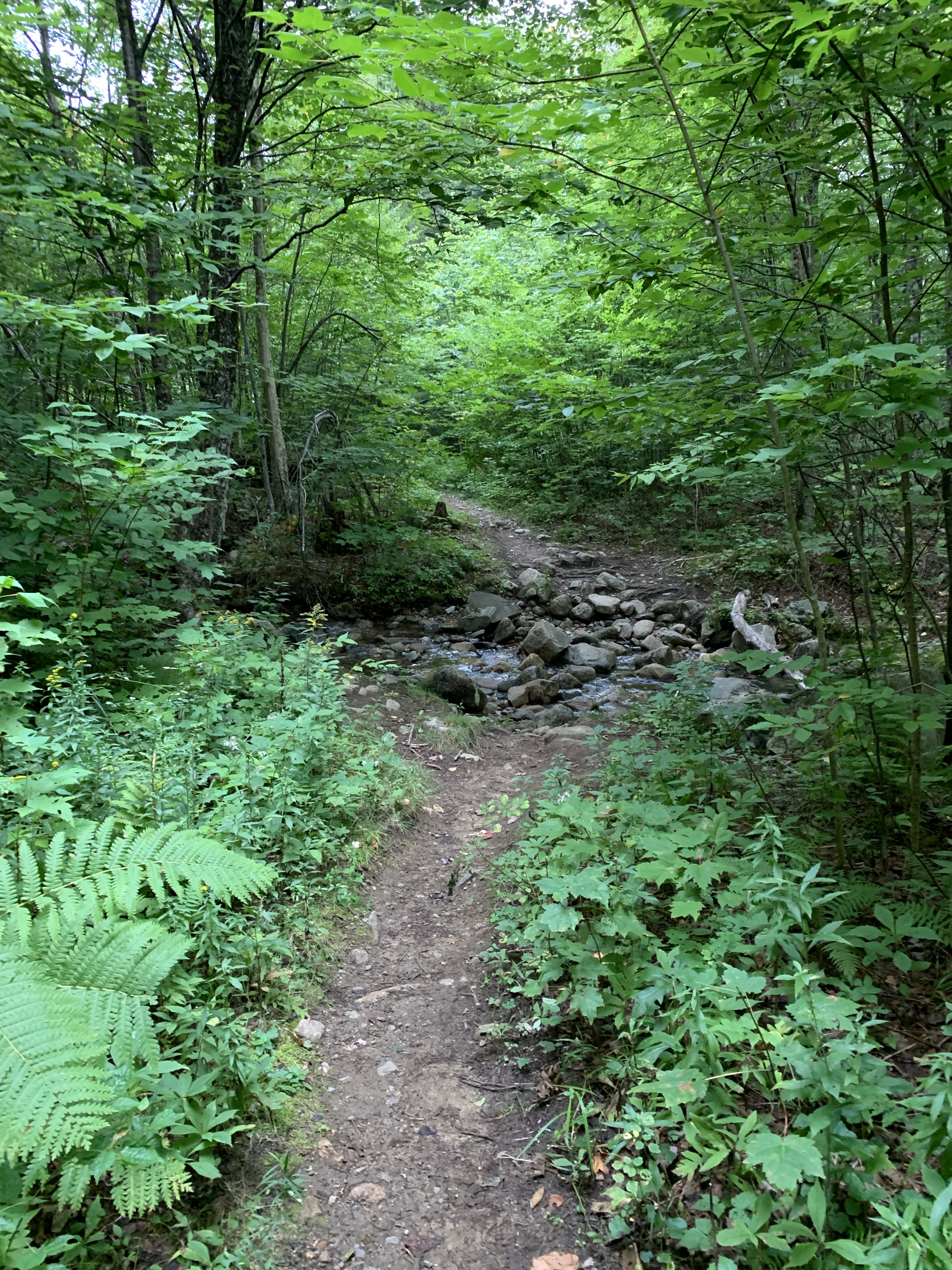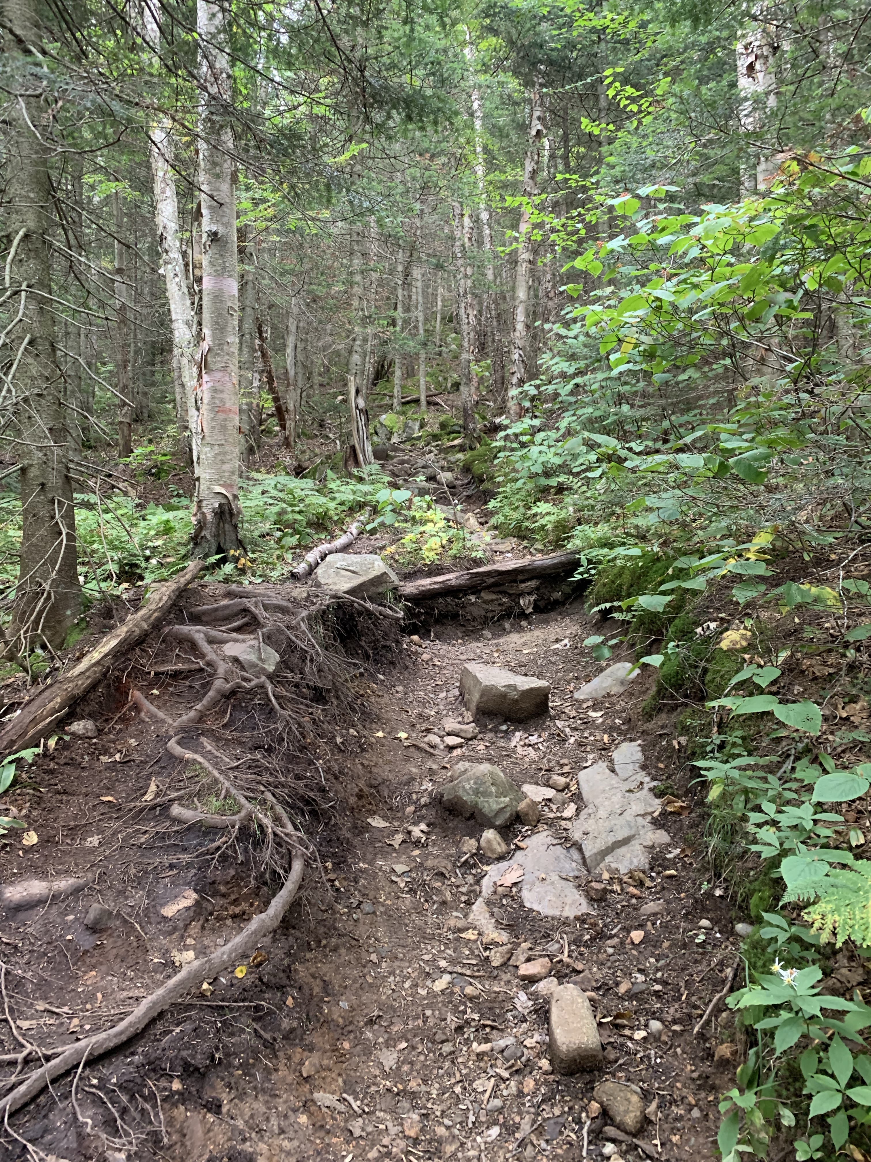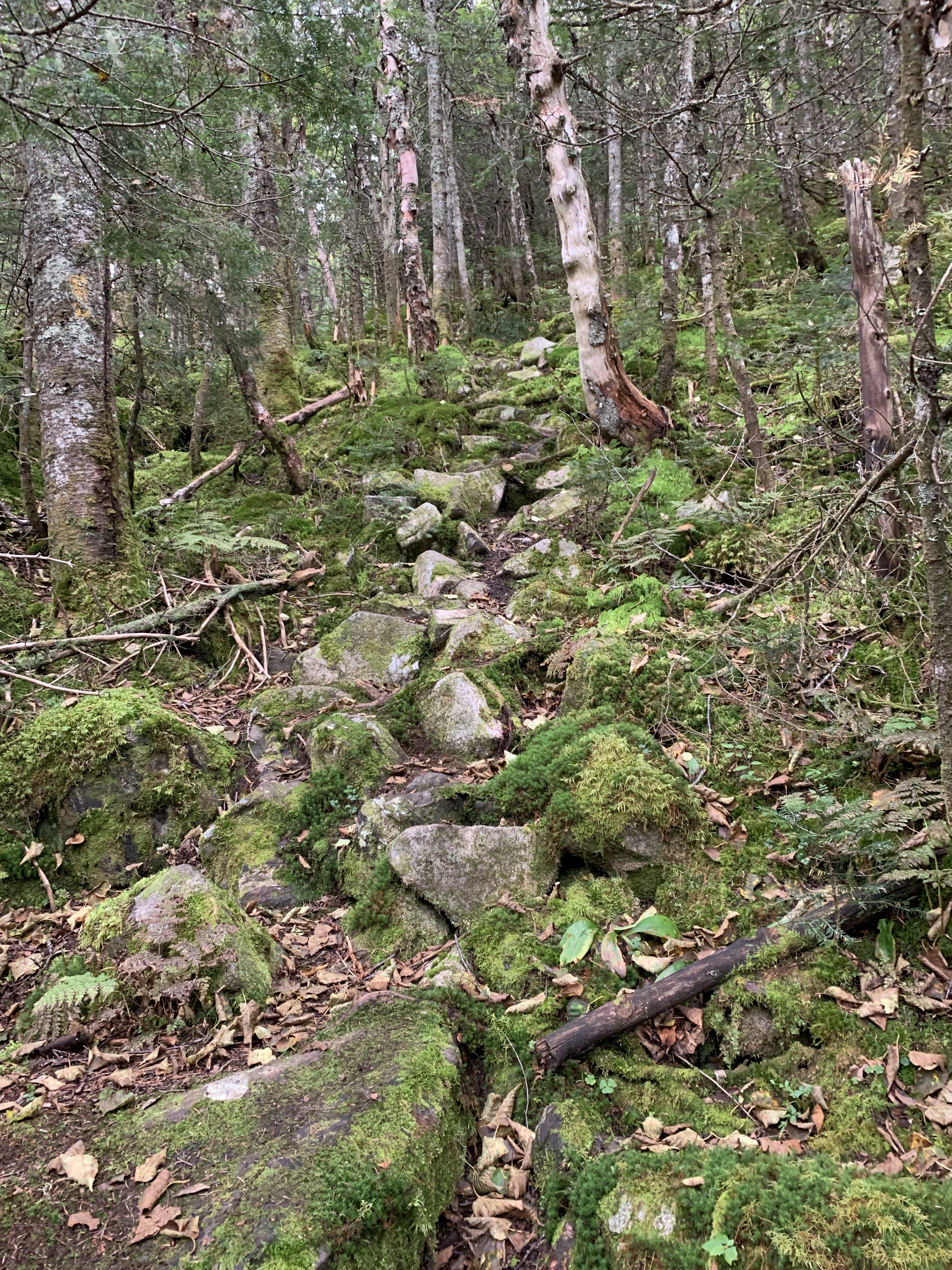 I left Terrace descending sharply into Willard Notch. It’s a beautiful moss covered wilderness walk. I was struck with thoughts of how very alone I was on this hike. I saw people on Bunnell Notch Trail just before I turned onto Kilkenny Ridge Trail at around 9:30 am. It was now almost noon and I had not seen a person. Its very peaceful, I like to be alone on the trail. But if I was to get hurt on these steep ascents and descents it would be a long time before I would get help. I did seem to have intermittent cell access which made me feel better. On my list of things to buy is a Garmin InReach Satellite Communication device. They range in price and function from $350 – $600. They have instant SOS which transmits your location to rescue services via the US Coast Guard. They ALWAYS work when cell phones will not. Worth the money, I will get one.
