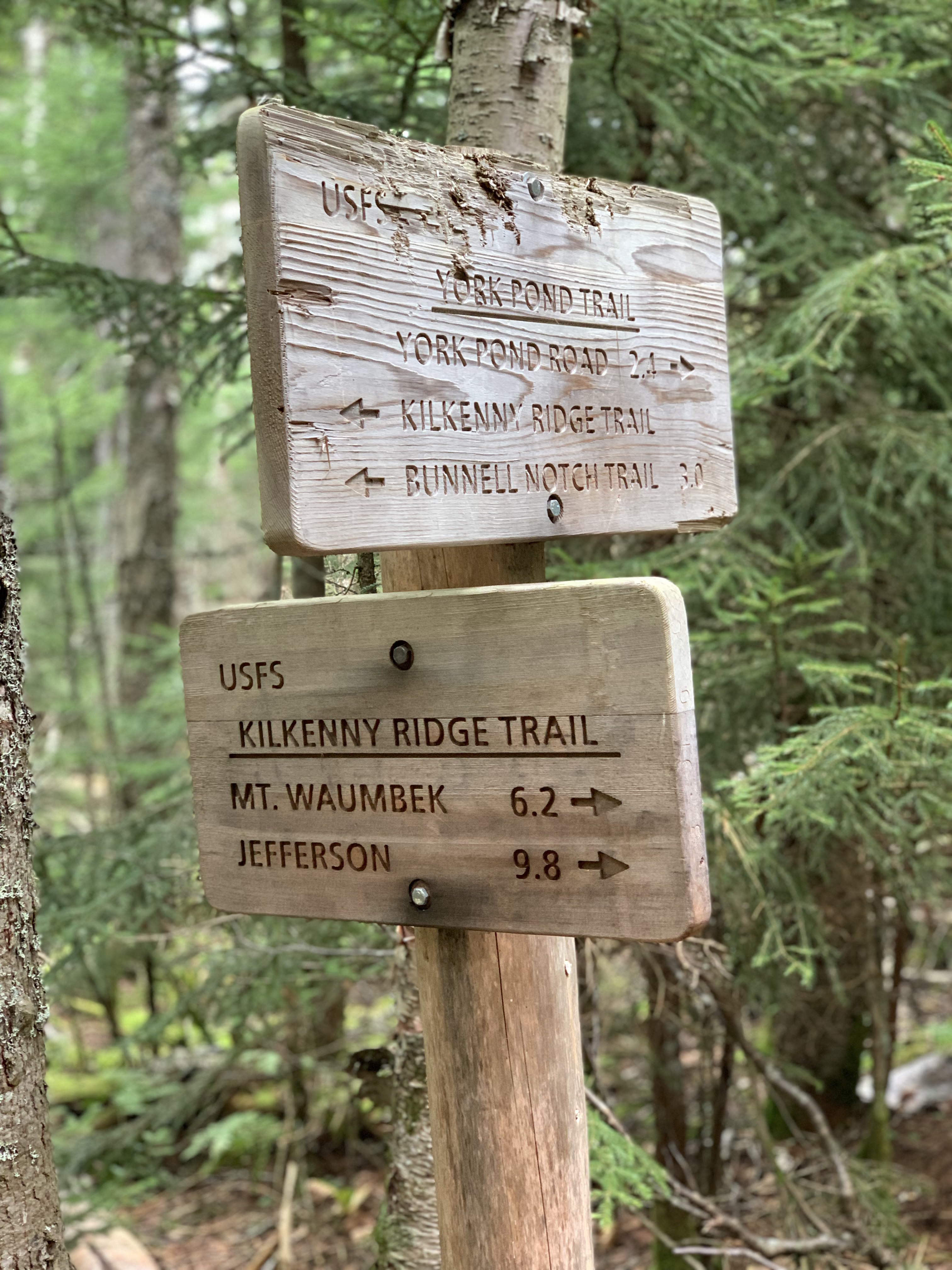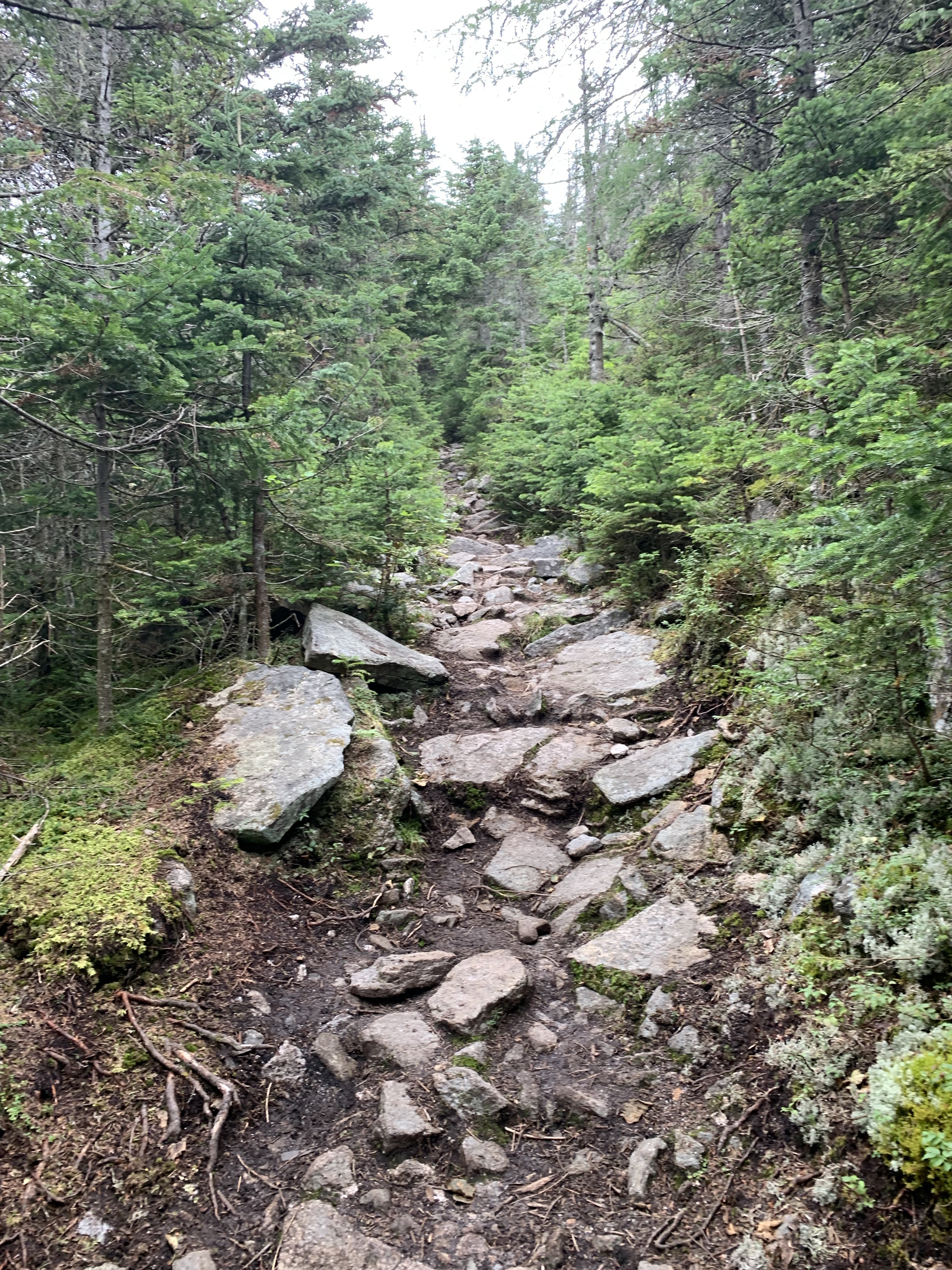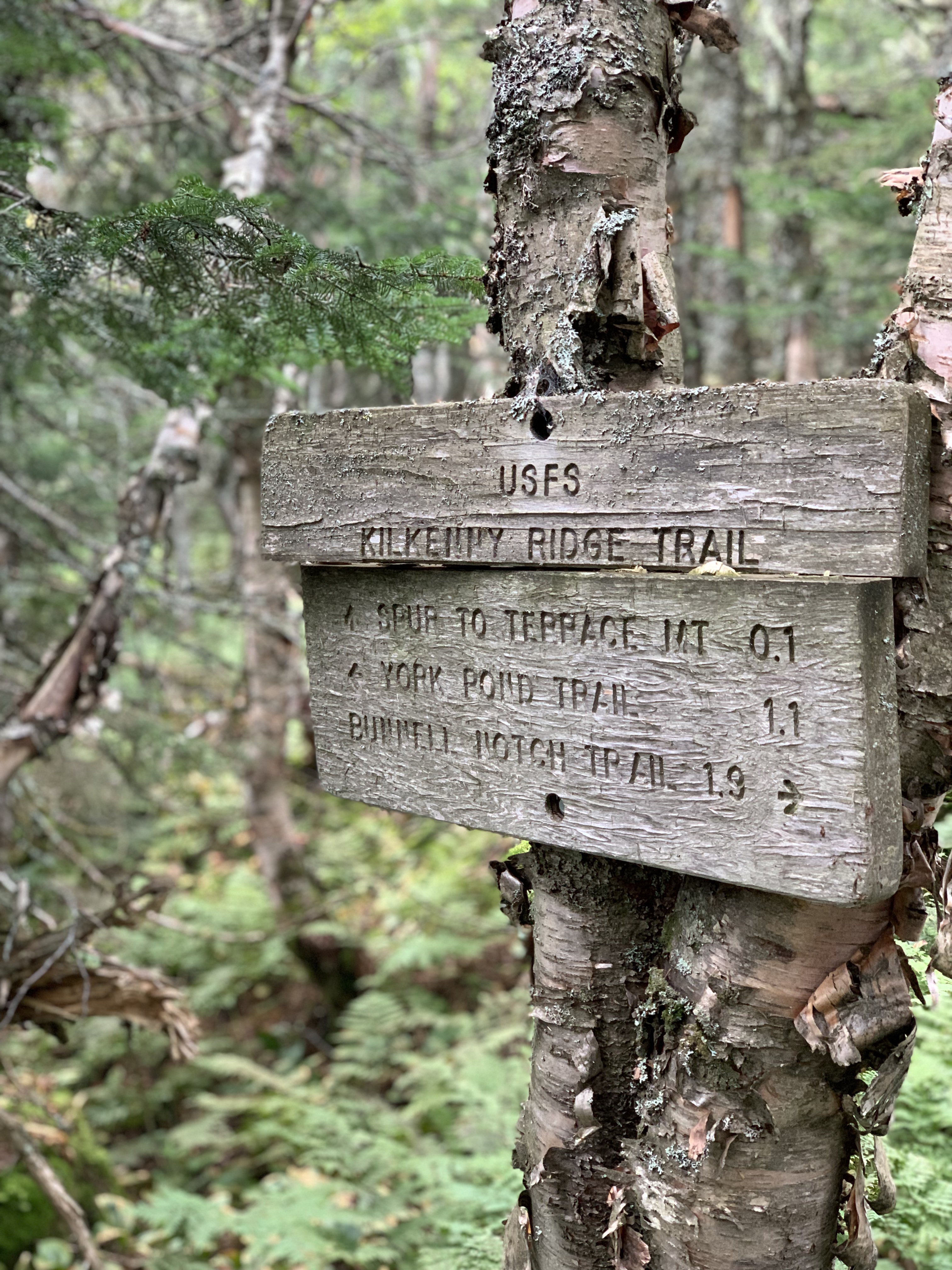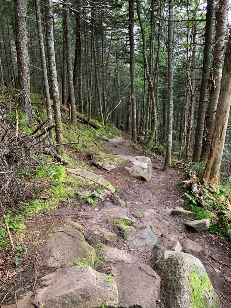 I chatted briefly with a guy sitting at the summit writing. I learned that he writes his daughter a letter from each mountain he climbs. Makes me wish I had found my adventure and calling long ago. I had a Cliff Bar and some water and then left the way I came, Mt Cabot Trail. On the way up I walked past the turn to Kilkenny Ridge Trail. This time, I took a right and headed into the deep woods.