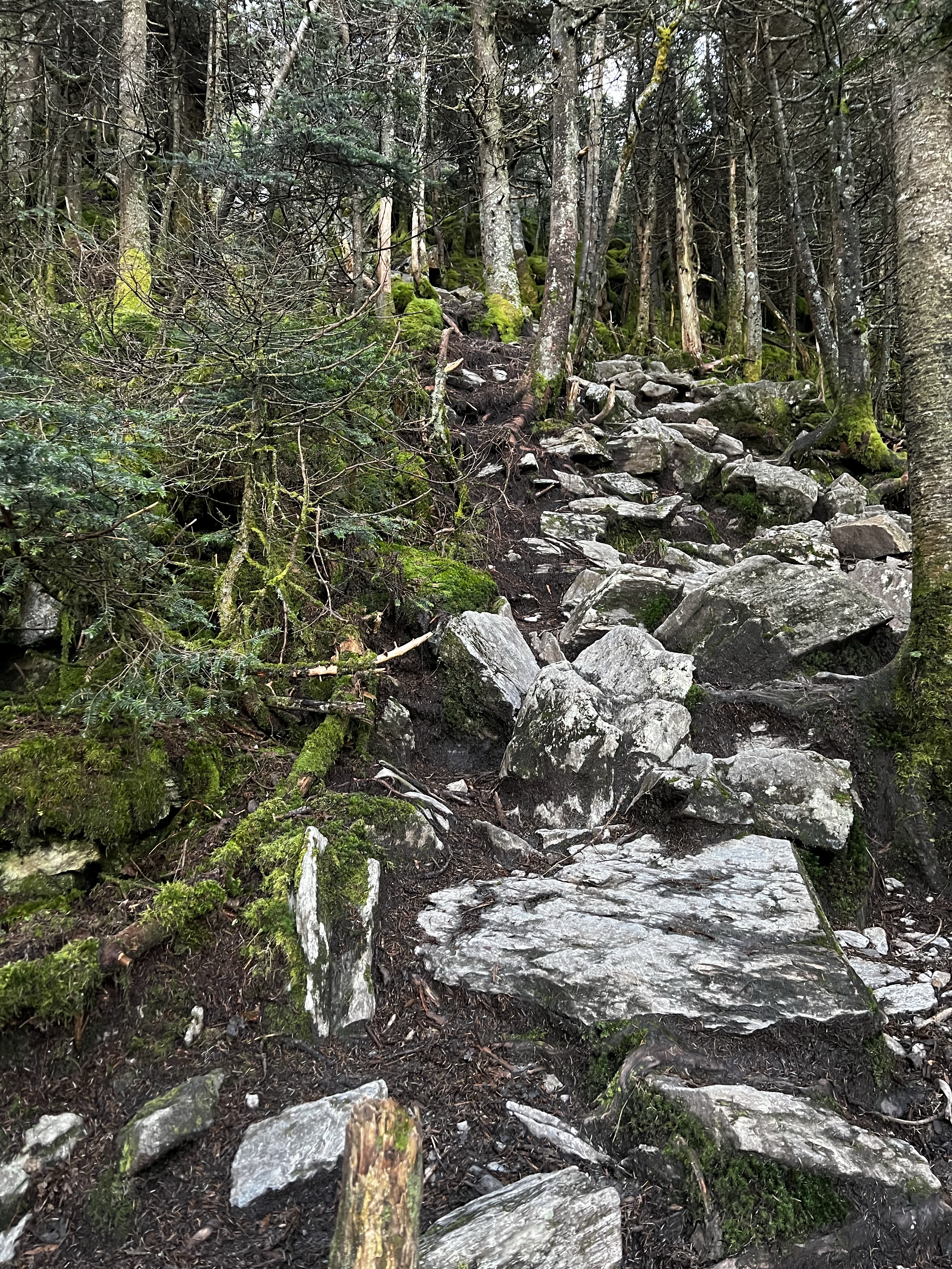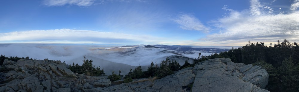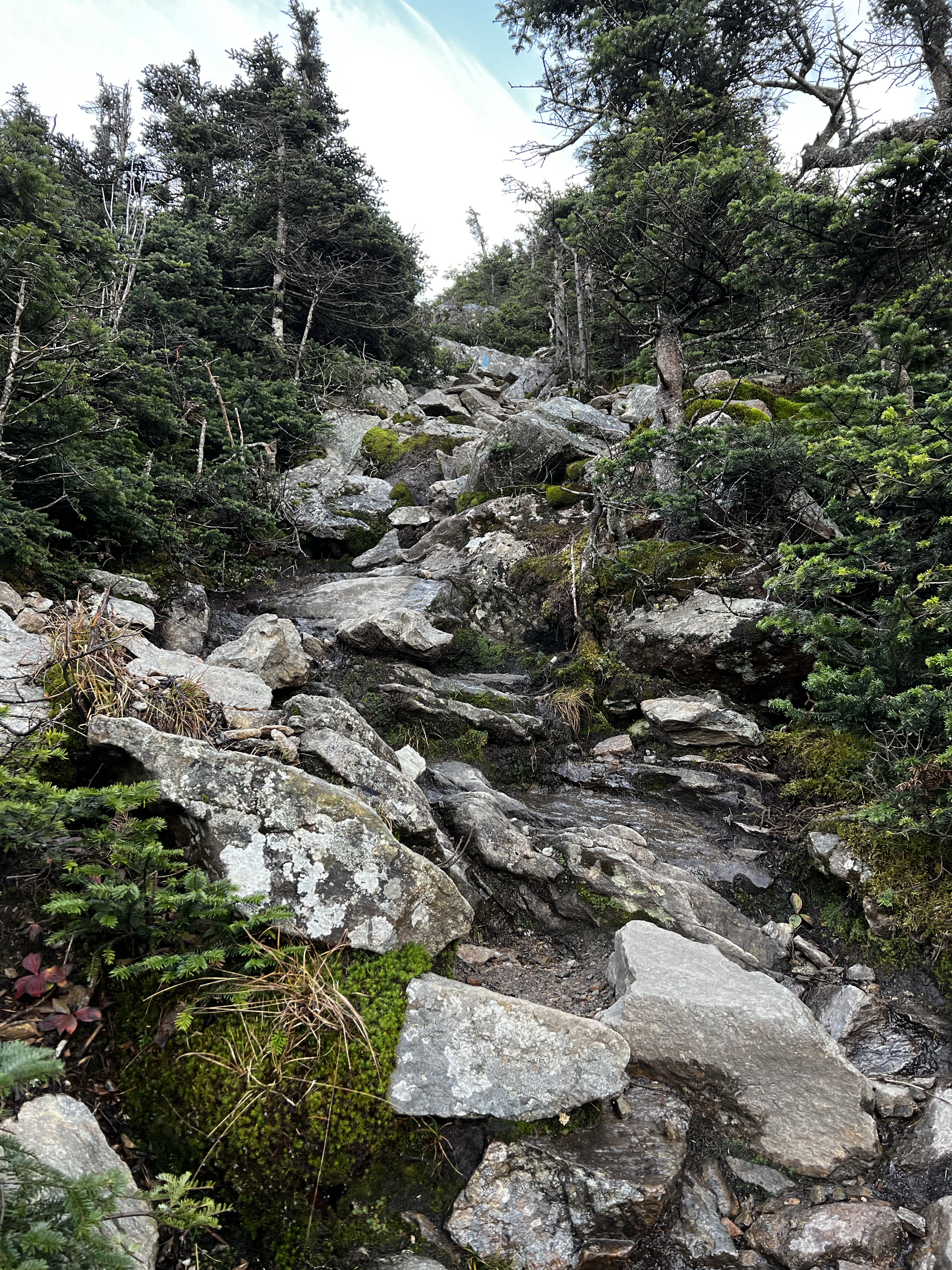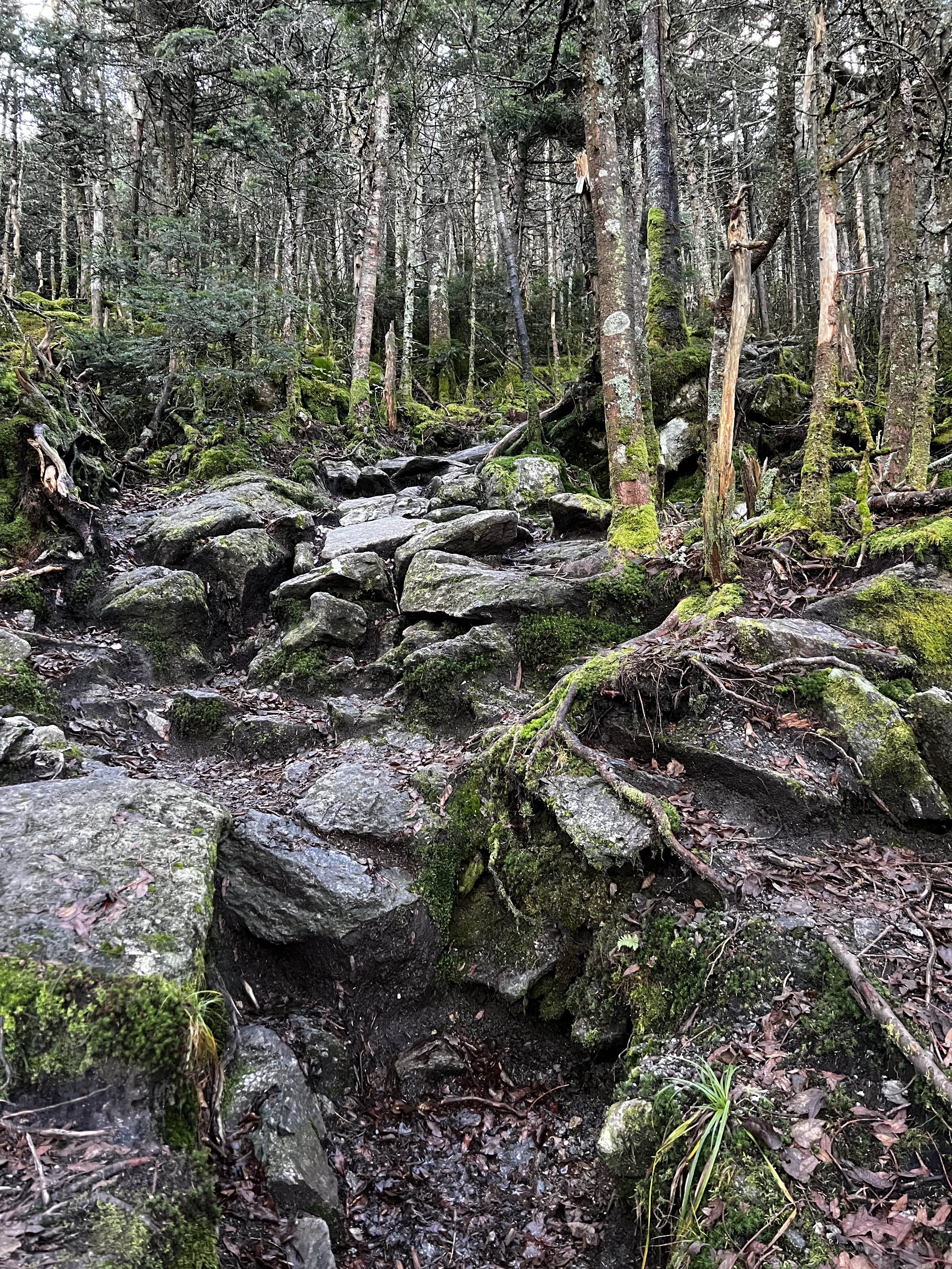 The sign said .2 miles from here to the summit via the Summit Spur. It felt more like a half mile. This section of trail from the tent sire to the summit was almost verticle. I began the climb up the relentlessly steep trail. It was a field of boulders with water running through in many locations. As I ascended the temperature was dropping a bit. It was 32 at the tent site. It had dropped a couple of degrees on my way u through this section. It was becoming difficult to tell what was ice and what was just wet. I was avoiding all wet parts now, in case was ice. It was very steep and not a good place to fall. There were several spots through this steep section where I was able to get some views. The undercast as I looked north was just amazing.