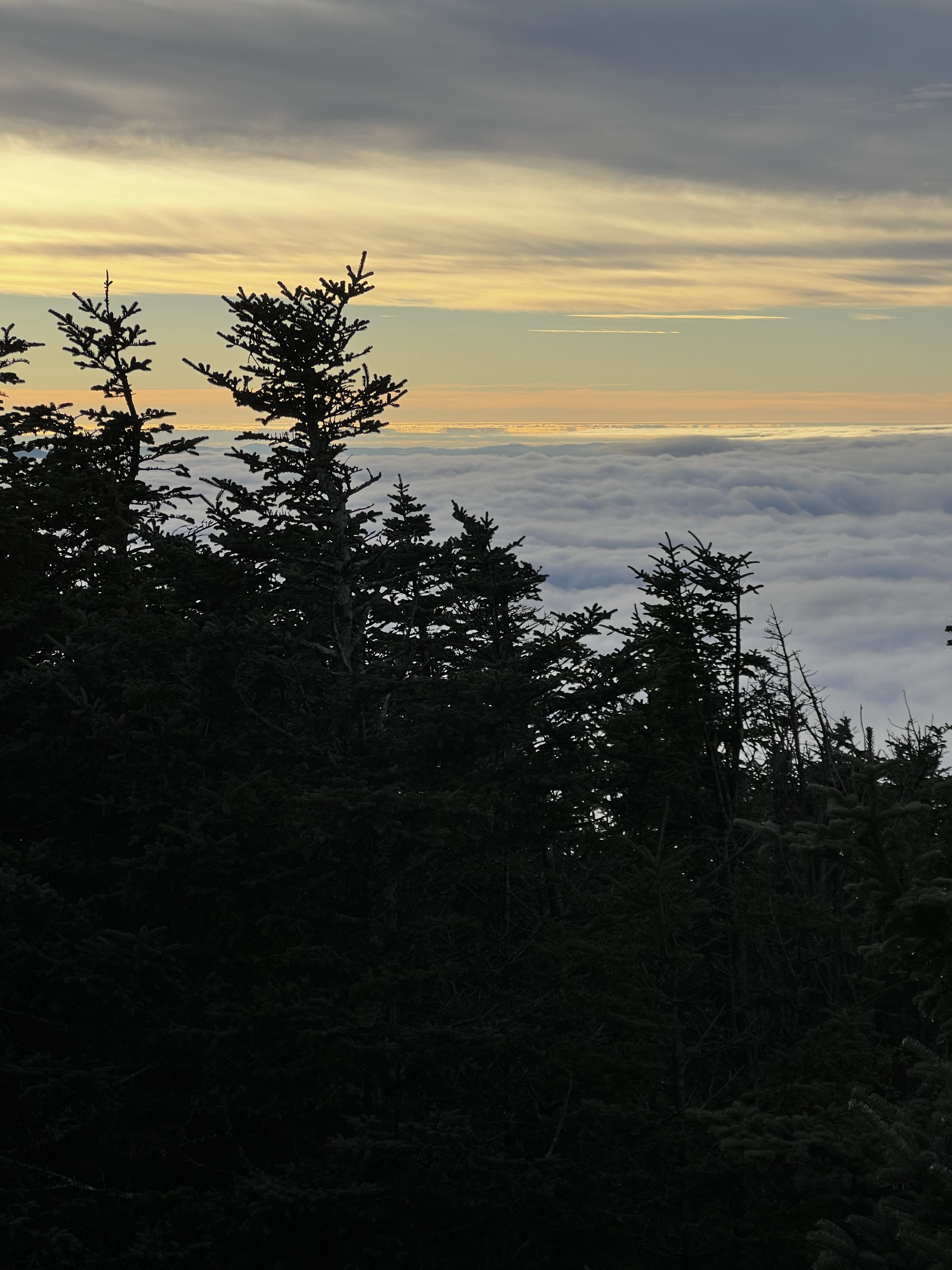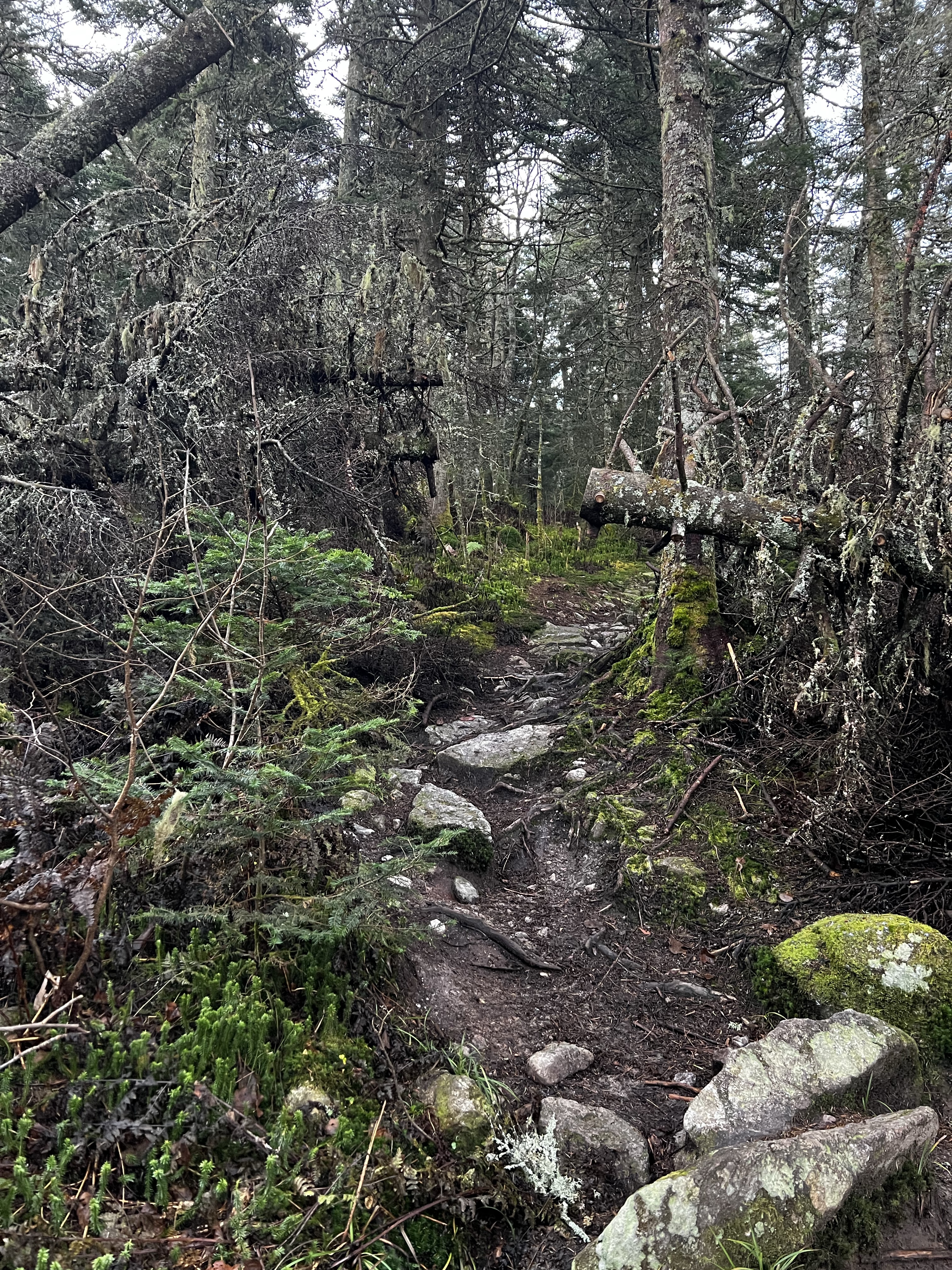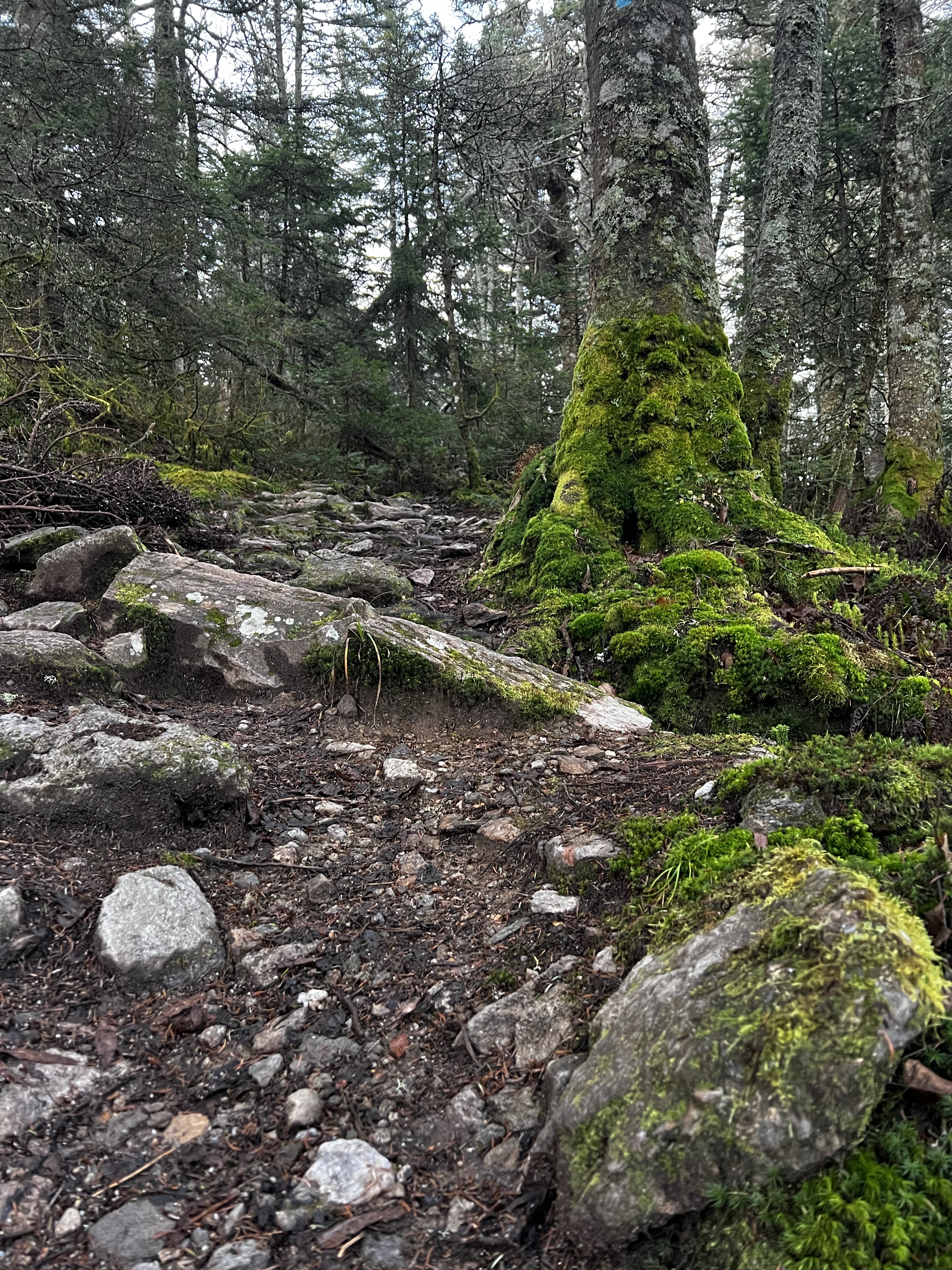 The sign said .2 miles from here to the summit via the Summit Spur. It felt more like a half mile. This section of trail from the tent sire to the summit was almost verticle. I began the climb up the relentlessly steep trail. It was a field of boulders with water running through in many locations. As I ascended the temperature was dropping a bit. It was 32 at the tent site. It had dropped a couple of degrees on my way u through this section. It was becoming difficult to tell what was ice and what was just wet. I was avoiding all wet parts now, in case was ice. It was very steep and not a good place to fall. There were several spots through this steep section where I was able to get some views. The undercast as I looked north was just amazing.